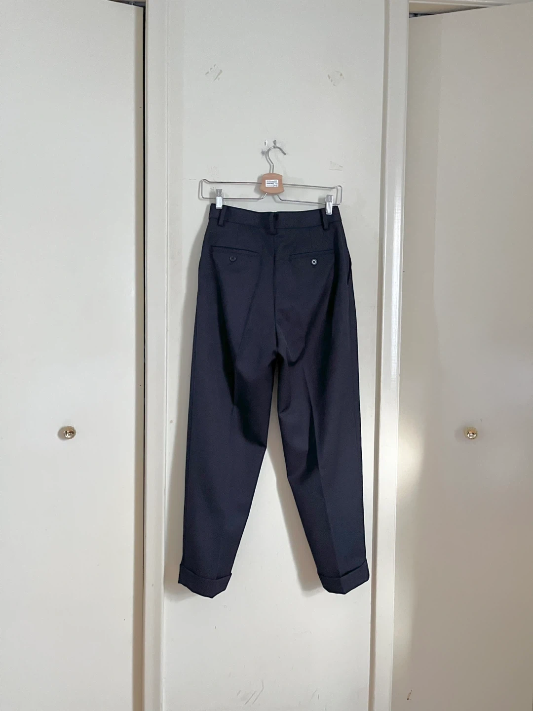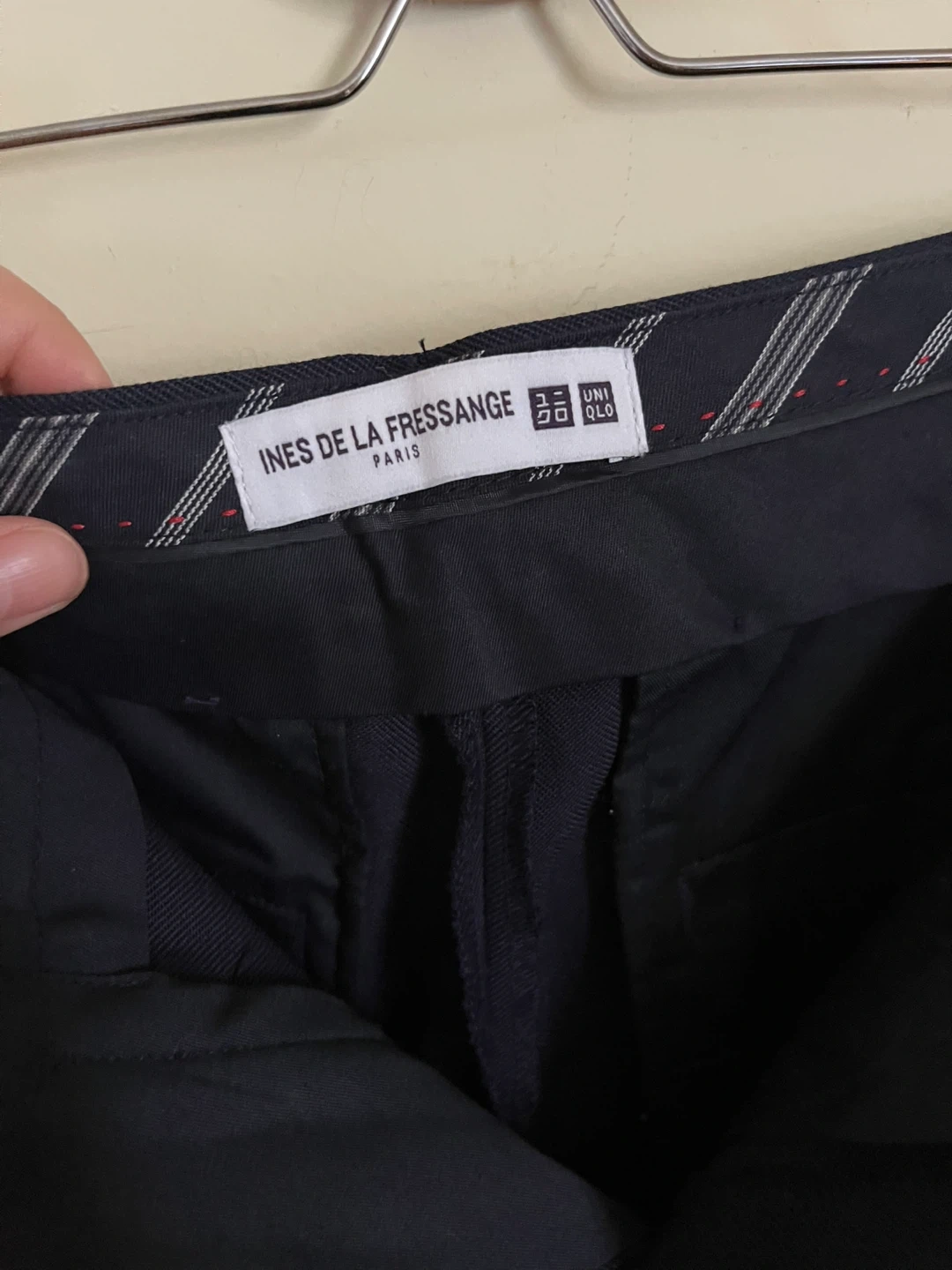 UNIQLO Ines de la Fressange Paris navy trousers. These pants are a blend of 40% wool, 40% polyester, and 20% rayon. They feature a 25-inch waist and a length of 33.5cm. Perfect for a smart casual look!