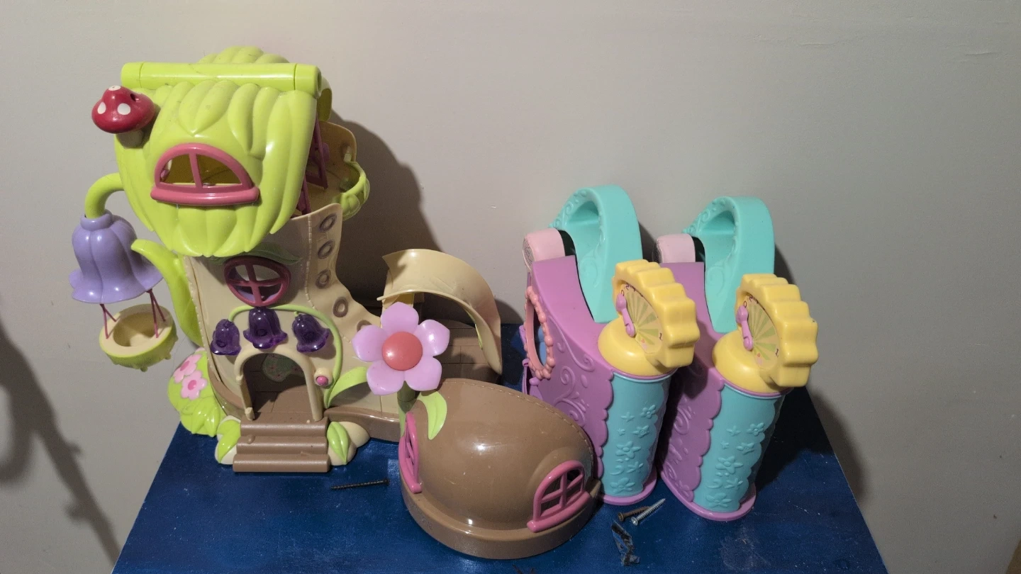 This is a colourful fairy house playset, shaped like a boot with a mushroom on top. It includes additional accessory pieces for imaginative play. This toy is made of plastic.