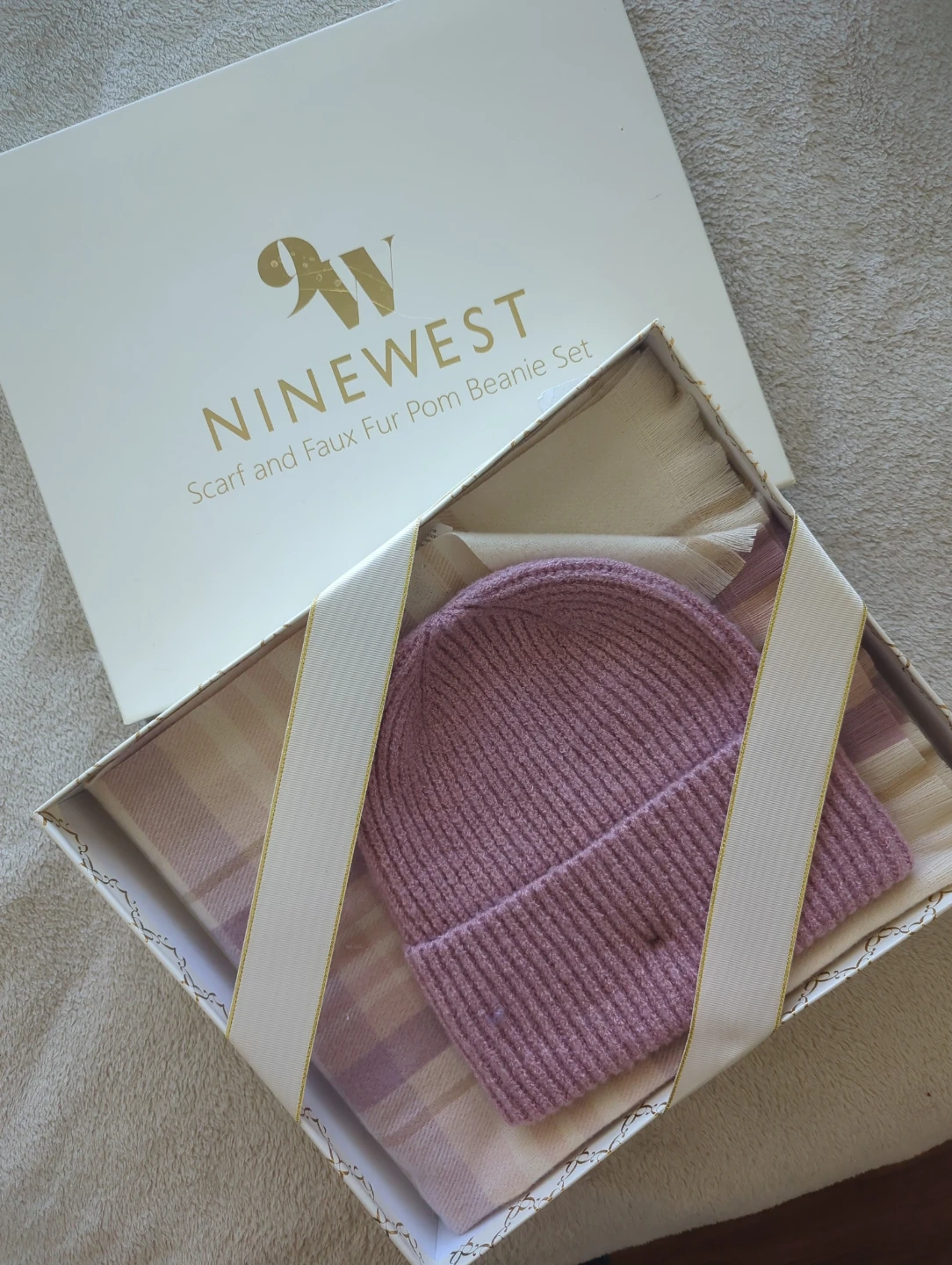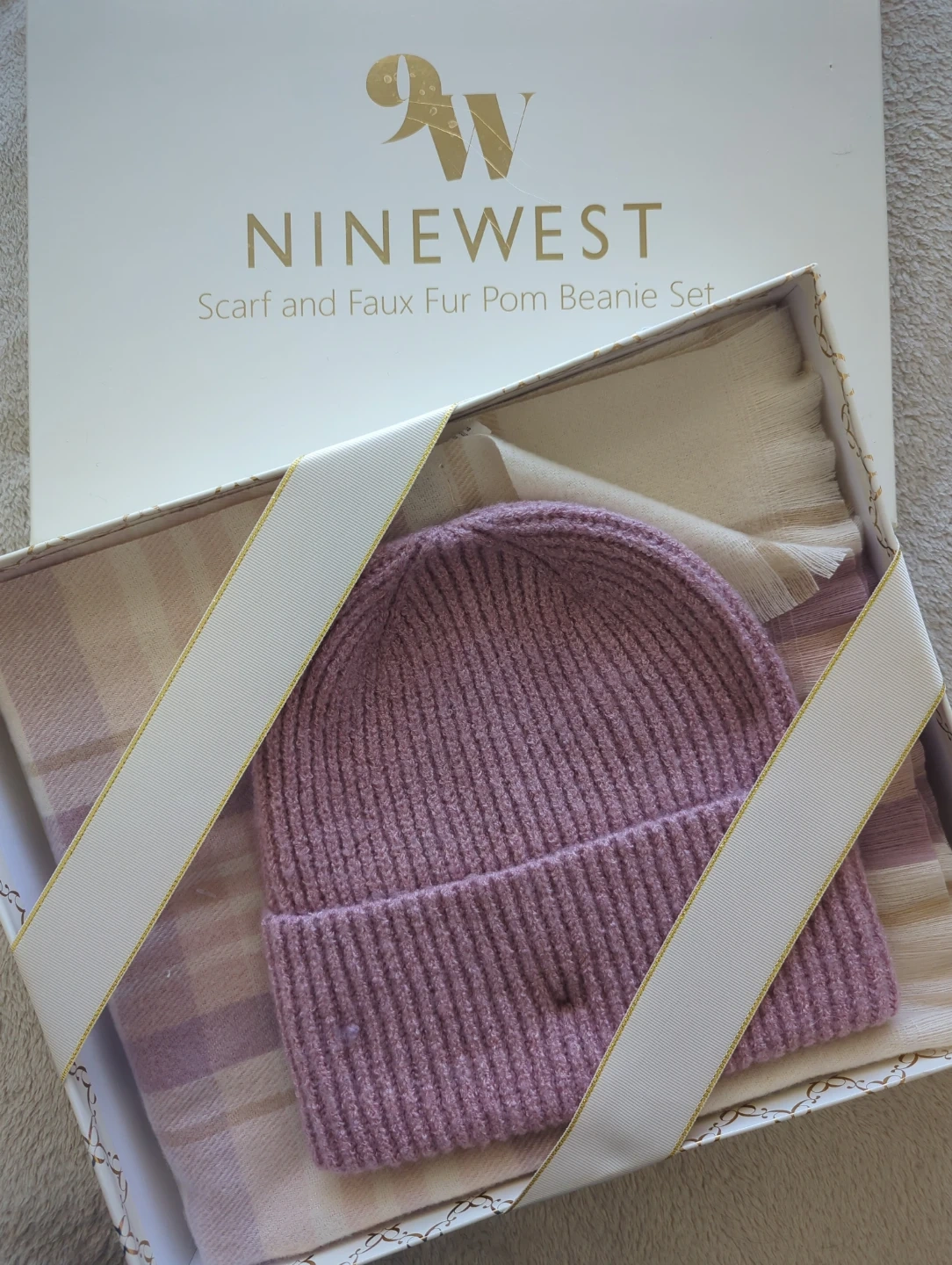 This is a Nine West scarf and beanie set. The beanie is ribbed knit with a faux fur pom pom. The scarf has a plaid pattern. It's presented in a gift box. BRAND NEW.