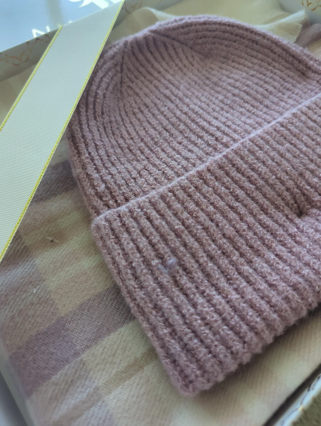 This is a Nine West scarf and beanie set. The beanie is ribbed knit with a faux fur pom pom. The scarf has a plaid pattern. It's presented in a gift box. BRAND NEW.
