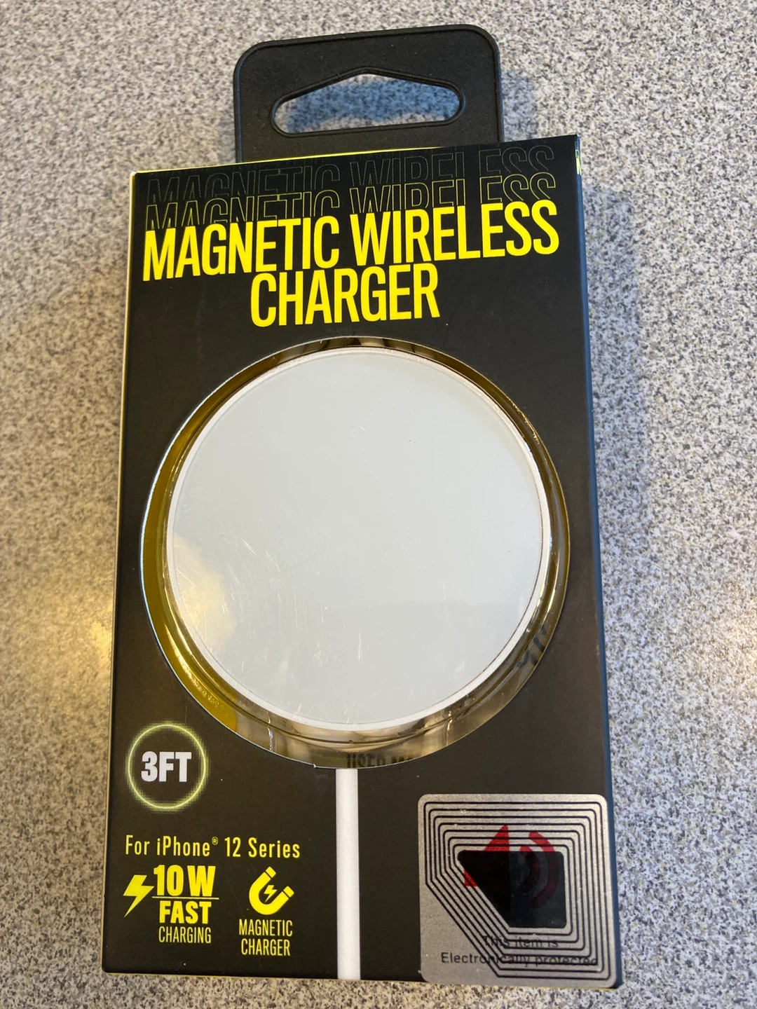 This magnetic wireless charger offers 10W fast charging for iPhone 12 series devices. It features strong and safe magnetic connectors and requires a USB-C enabled power source. It's compatible with iPhone 8 and newer Qi-enabled devices. Includes charger and instructions.