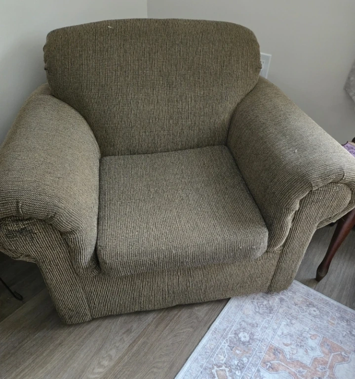 Comfortable three-seater sofa and matching armchair in a neutral beige woven fabric. These pieces offer ample seating for your living room. Sofa dimensions are approximately 84 inches wide, 38 inches deep, and 36 inches high. Armchair dimensions are approximately 40 inches wide, 38 inches deep, and 36 inches high.