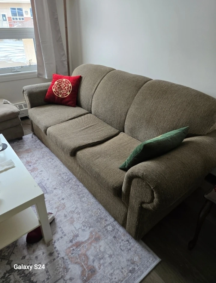 Comfortable three-seater sofa and matching armchair in a neutral beige woven fabric. These pieces offer ample seating for your living room. Sofa dimensions are approximately 84 inches wide, 38 inches deep, and 36 inches high. Armchair dimensions are approximately 40 inches wide, 38 inches deep, and 36 inches high.
