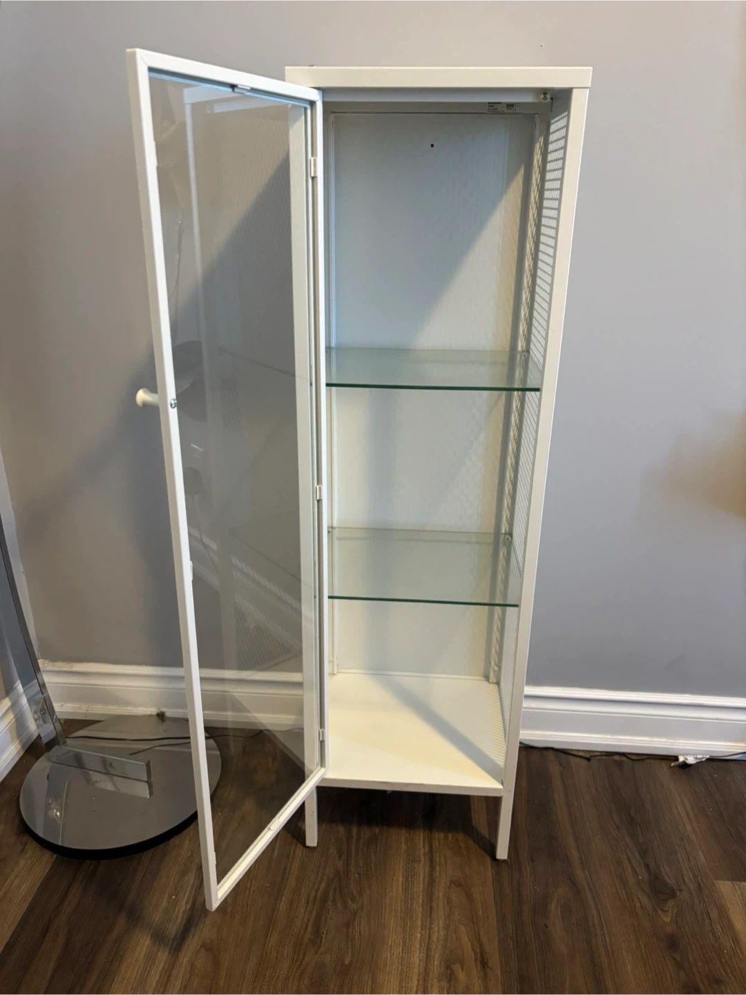 One white metal cabinets with glass doors and shelves. Adjustable feet. Great for displaying collectables! The two glass shelves are easily removable for larger items and moving.