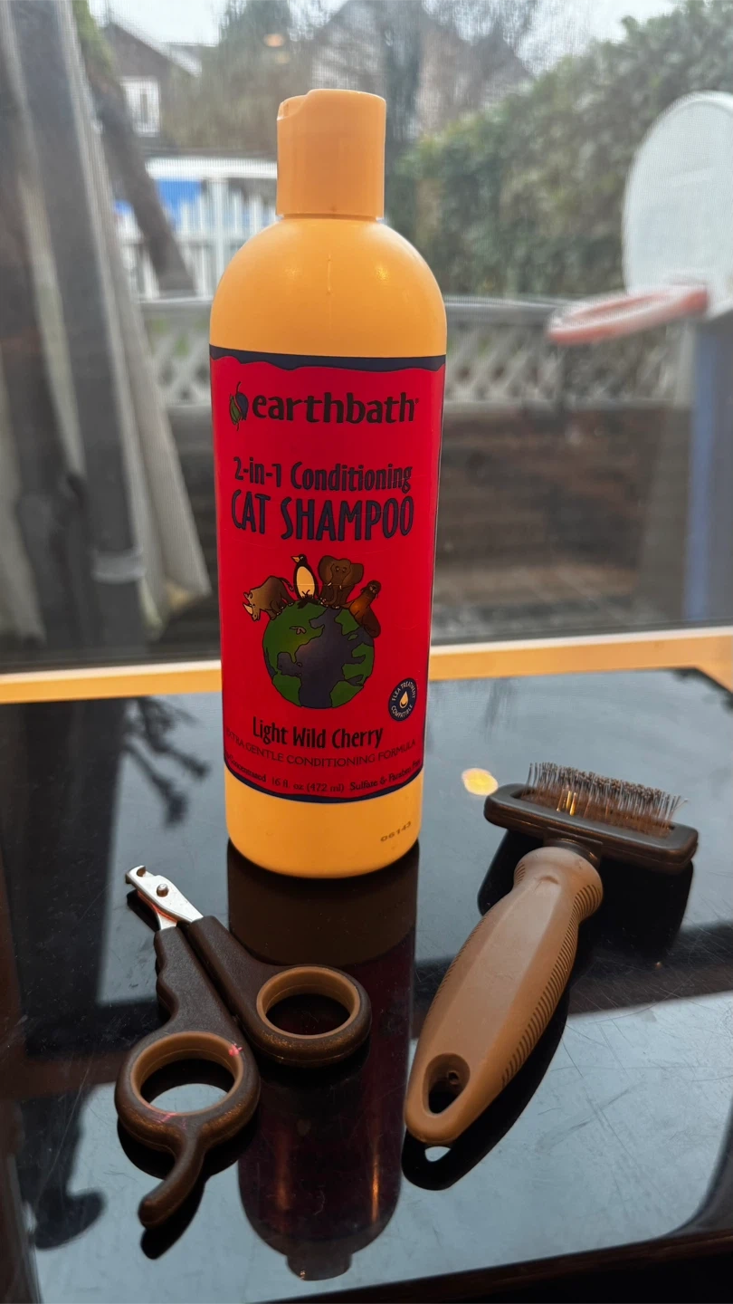 Earthbath 2-in-1 Conditioning Cat Shampoo in Light Wild Cherry scent. This gentle conditioning formula comes in a 16 fl oz (472 ml) bottle. It's made to clean and condition your cat's fur. 3/4 full & includes a fur brush and claw clipping scissors.