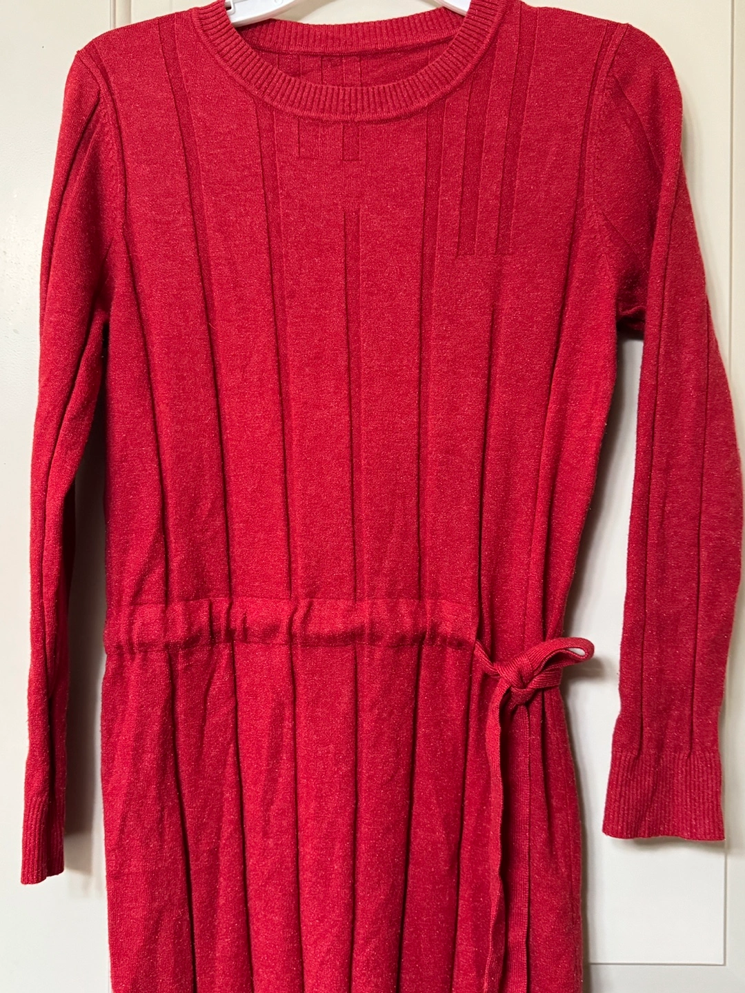 Wore 3 times only. Red knit sweater dress with long sleeves and a tie waist. It has a ribbed texture down the front and back.