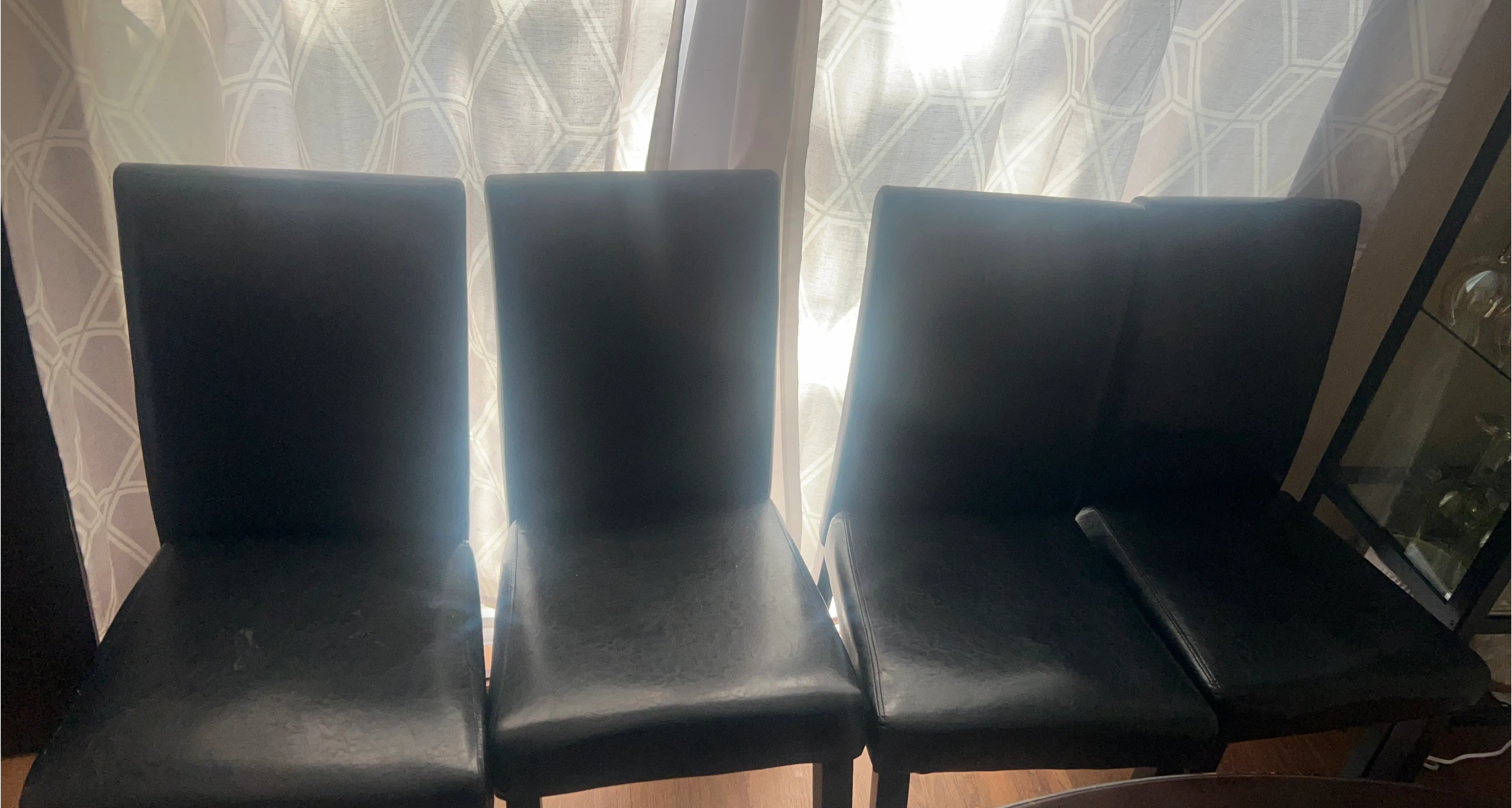 Four black dining chairs are available. These chairs have a faux leather finish. They're great for a dining room or kitchen table!