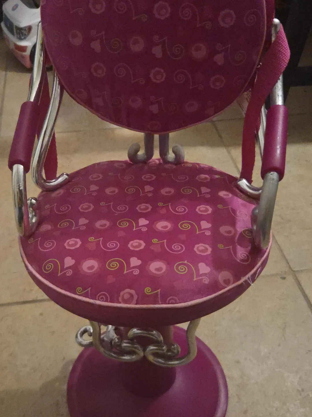 This is a pink doll hair salon chair. It's designed for pretend play with a swivel seat. The chair has a metal frame and purple padded armrests.