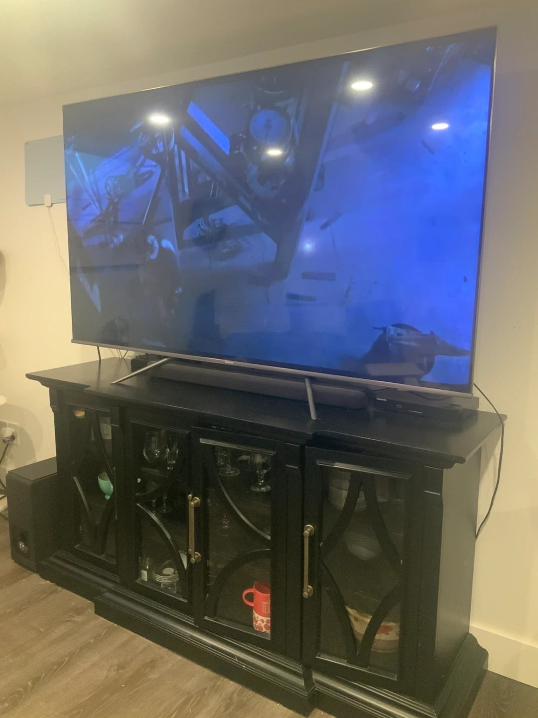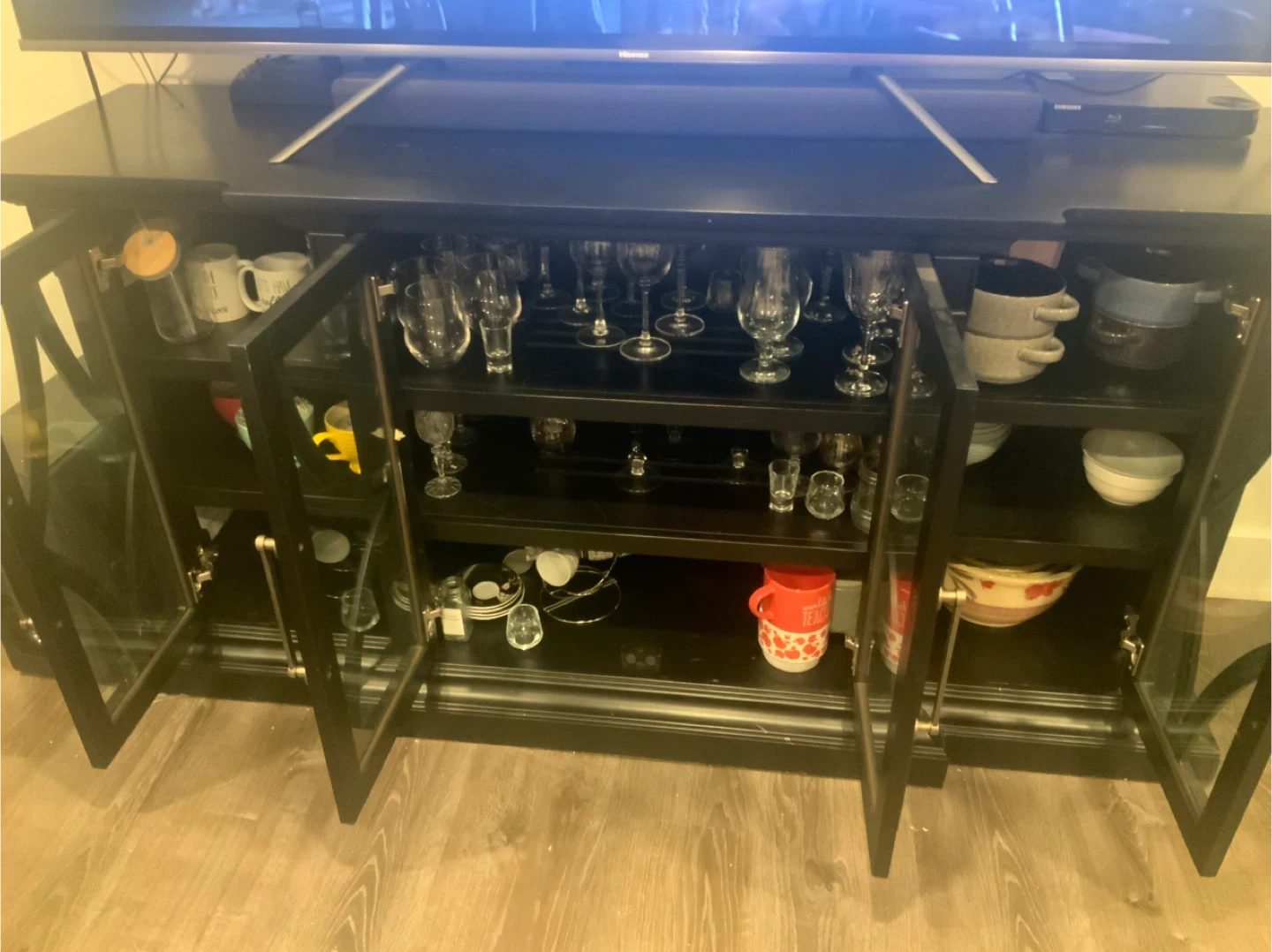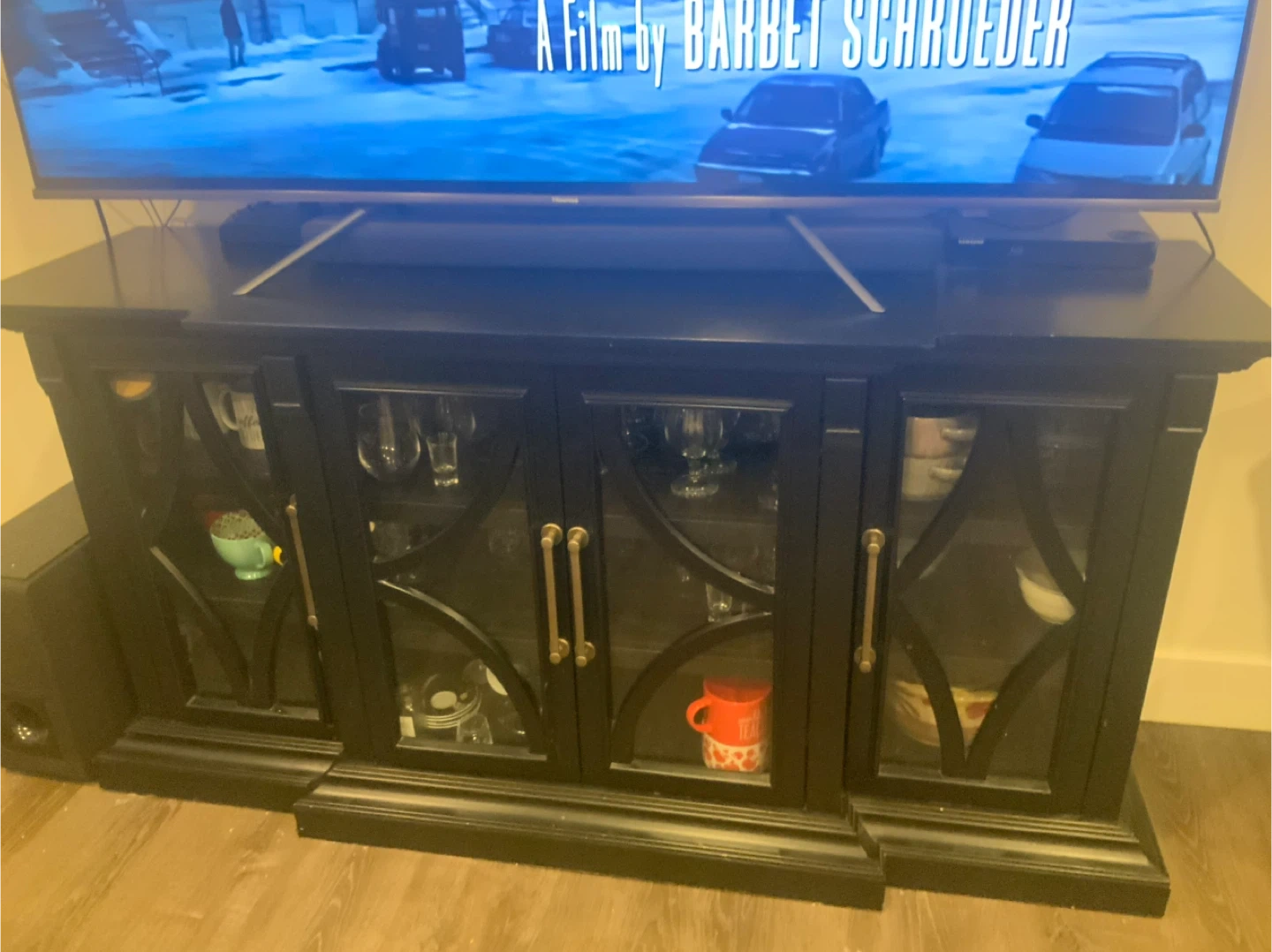 We are selling our solid credenza/display cabinet we purchased from Costco. It works perfect as a TV stand (currently holds a 75”TV) and has ample storage for dishes etc, featuring glass door fronts and a sleek black finish. This piece is in excellent condition and comes from a clean smoke free home. We are only selling because we moving out of town and are unable to bring it with us.