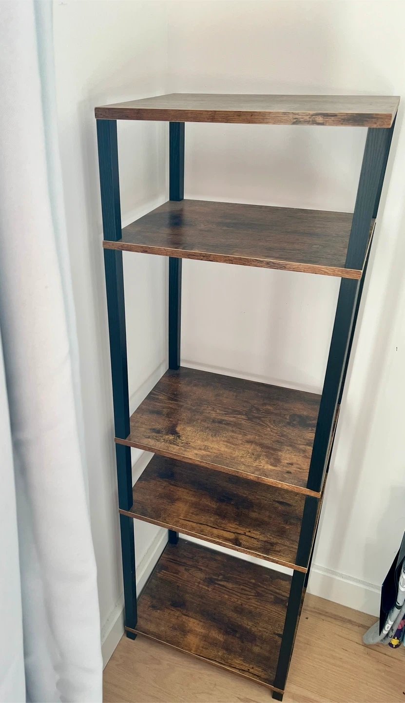 This bookshelf features a rustic brown wood finish with a black metal frame. It has four tiers for storage and display. It's great for organizing books or showcasing decor!