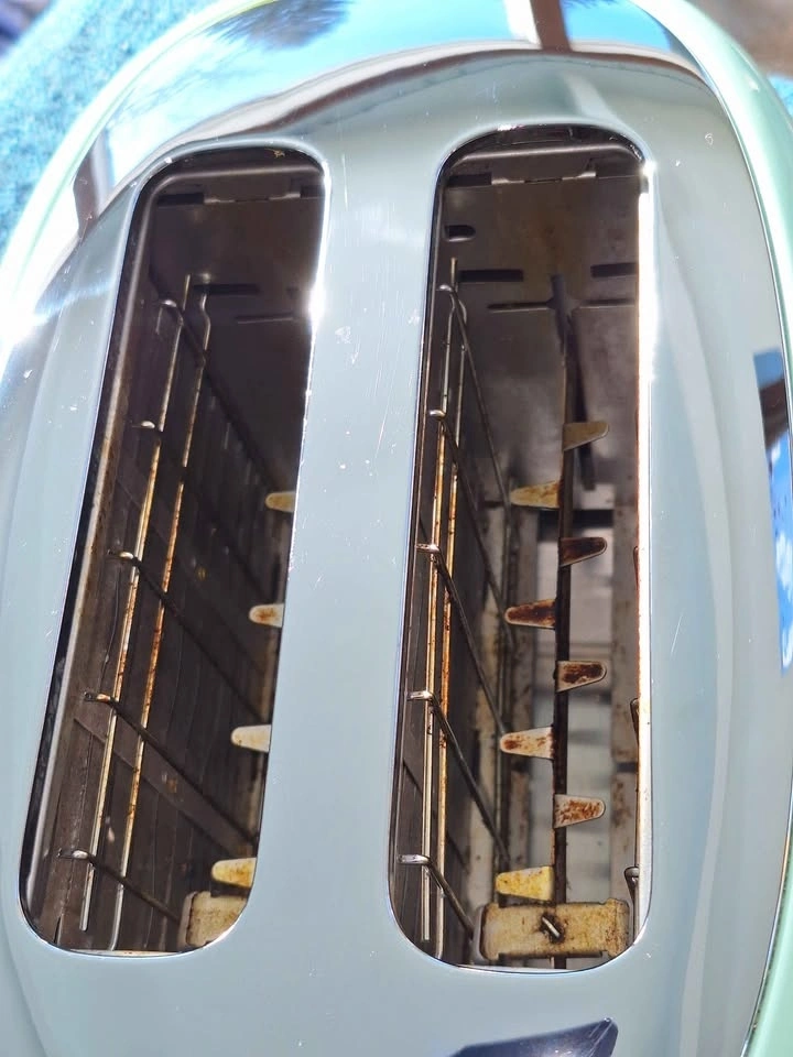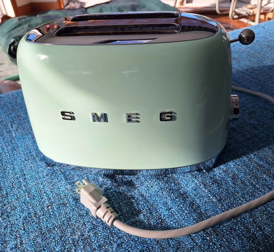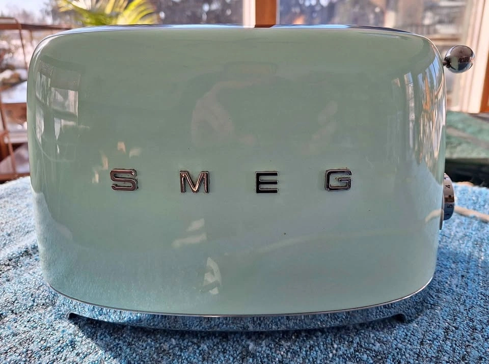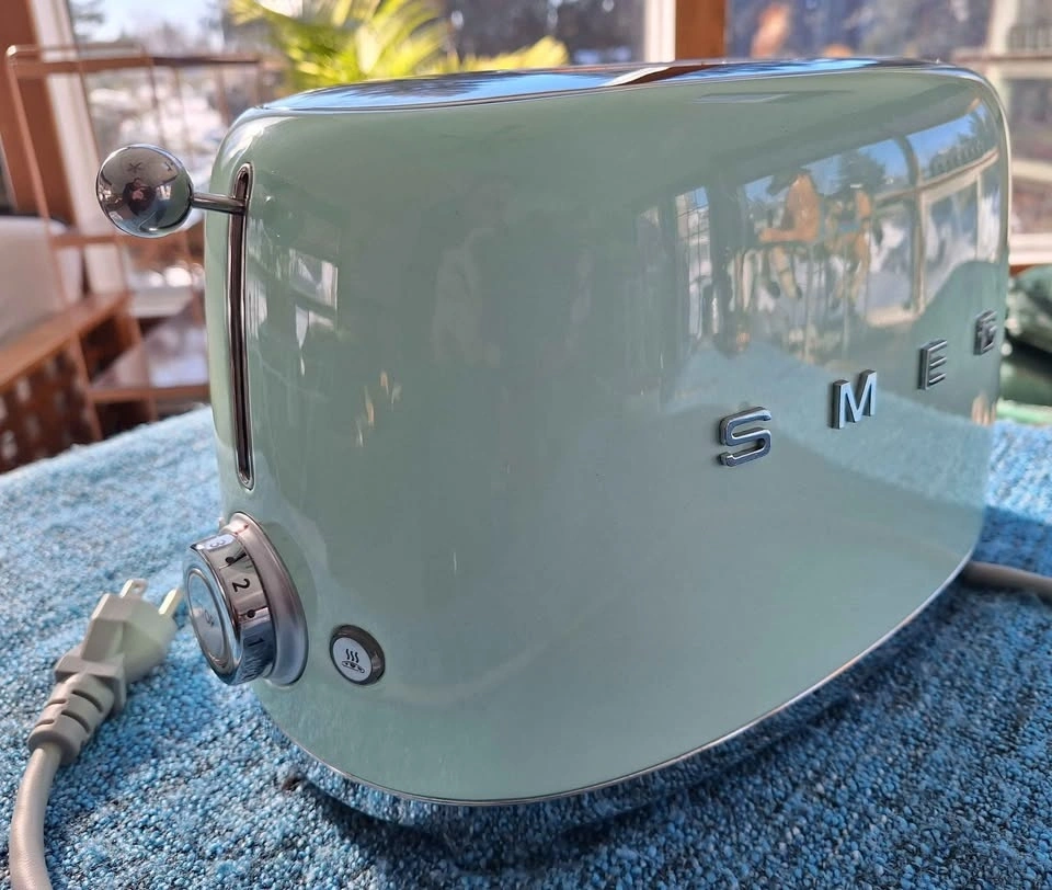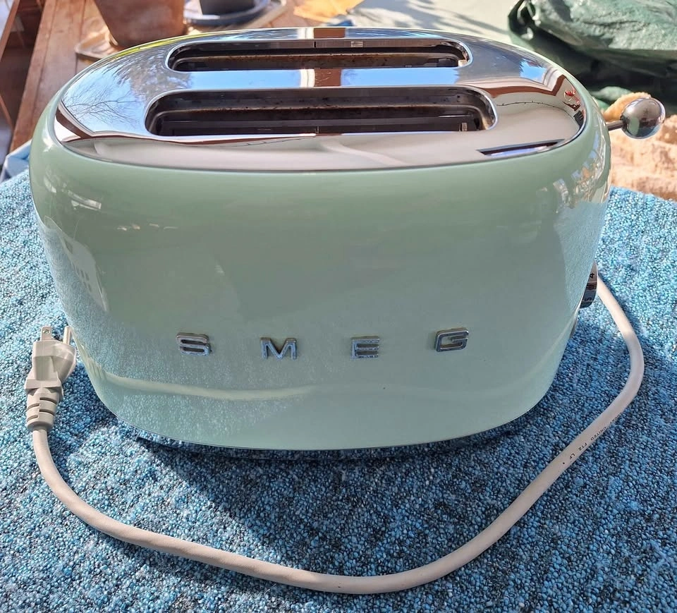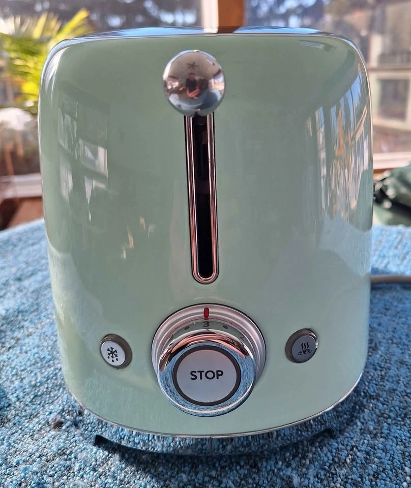 Smeg Retro Style 2 slice toaster in pastel green, removable crumb tray, 6 browning levels and single side defrost features. Hardly used with some light burn marks on the inside, outside chrome and shell is spotless. Pick up is Bloomington and 9th line area.