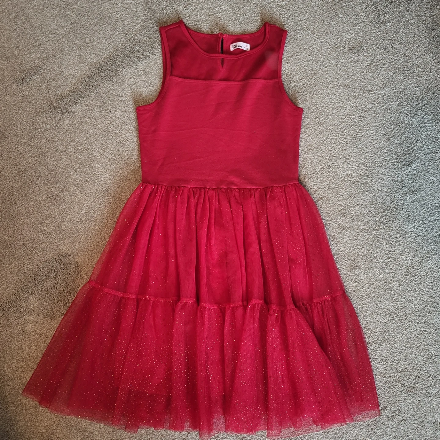 A pretty red sleeveless dress from Epic Threads with a tiered sparkly tulle skir in size XL. It's perfect for parties or special occasions. Machine washable.