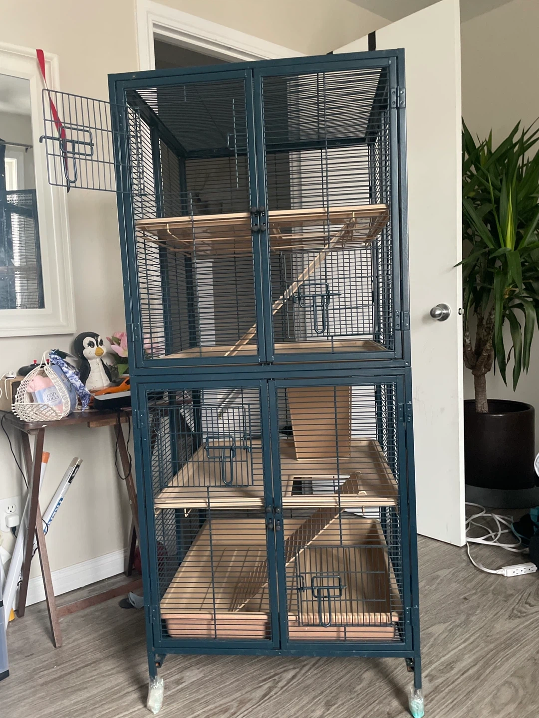 This is a spacious multi-level pet cage, perfect for small animals like hamsters or chinchillas. It comes with multiple wooden shelves and ramps for enrichment. The cage is constructed from durable metal and features several doors for easy access and cleaning.