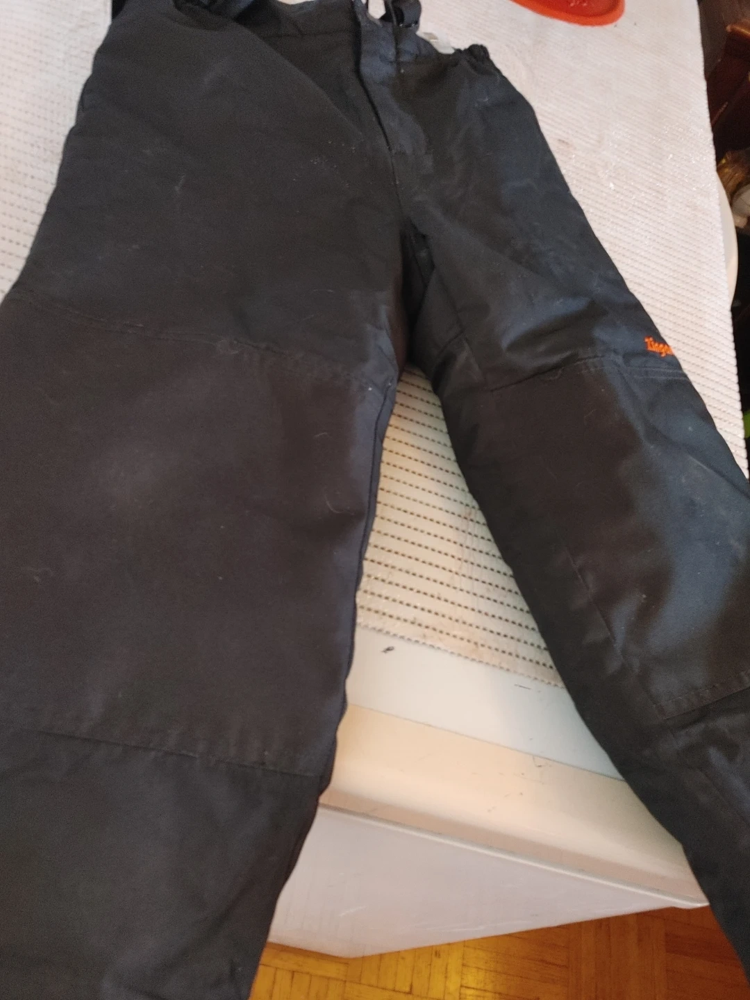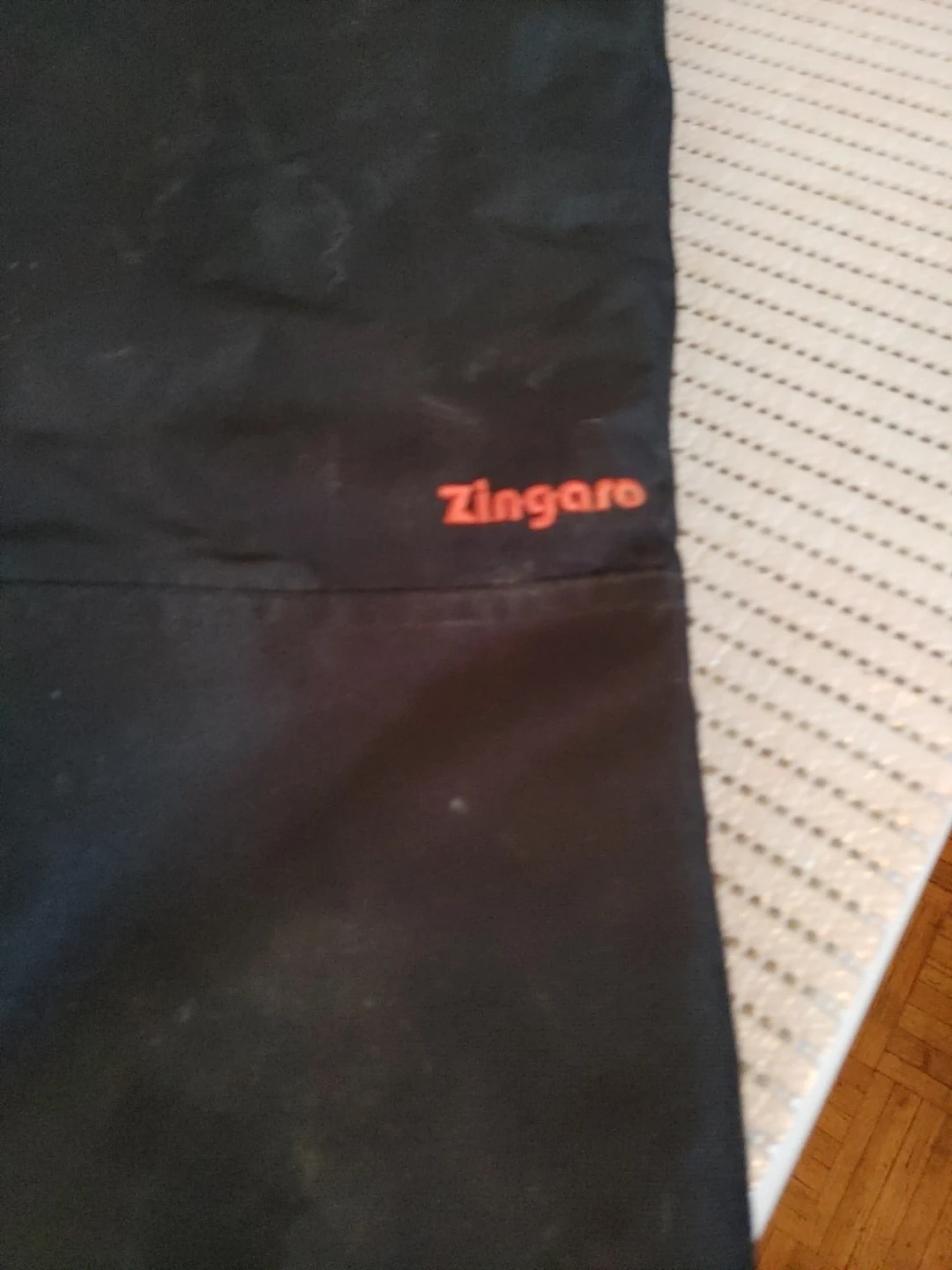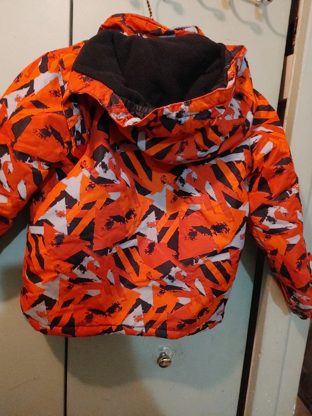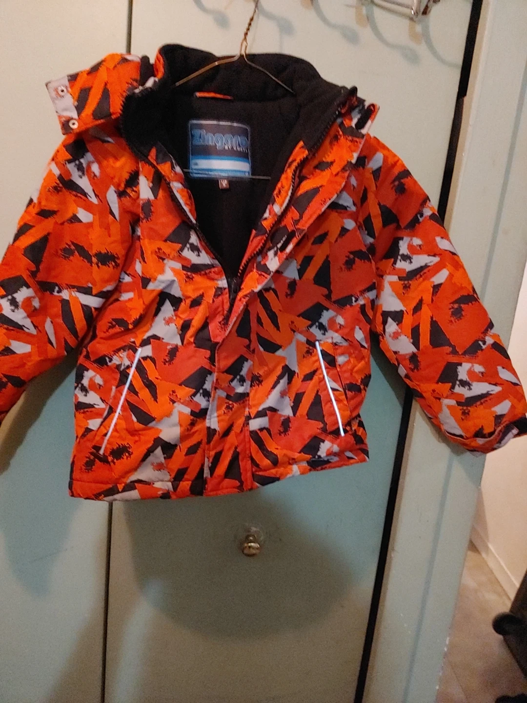 This is a Zingaro kids winter jacket and snow pants set. The jacket has a bold orange, black, and grey abstract pattern with reflective accents. Both pieces are black. Perfect for keeping warm during cold weather activities!