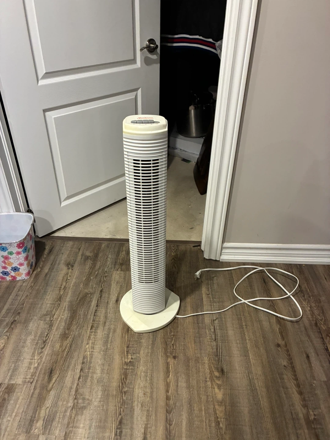 This is a white Sunbeam tower fan. It's a space-saving design for cooling. It has multiple speed settings.
