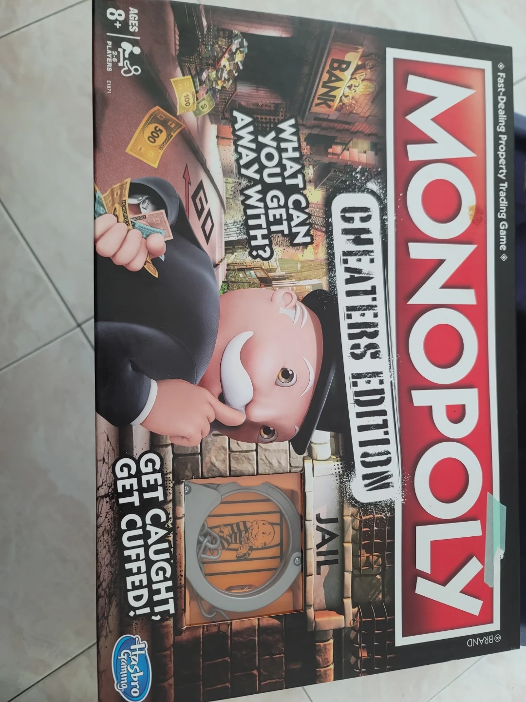 This is the Monopoly Cheaters Edition board game. It's designed for 2-6 players and ages 8 and up. Includes the game board, cards, and money. New