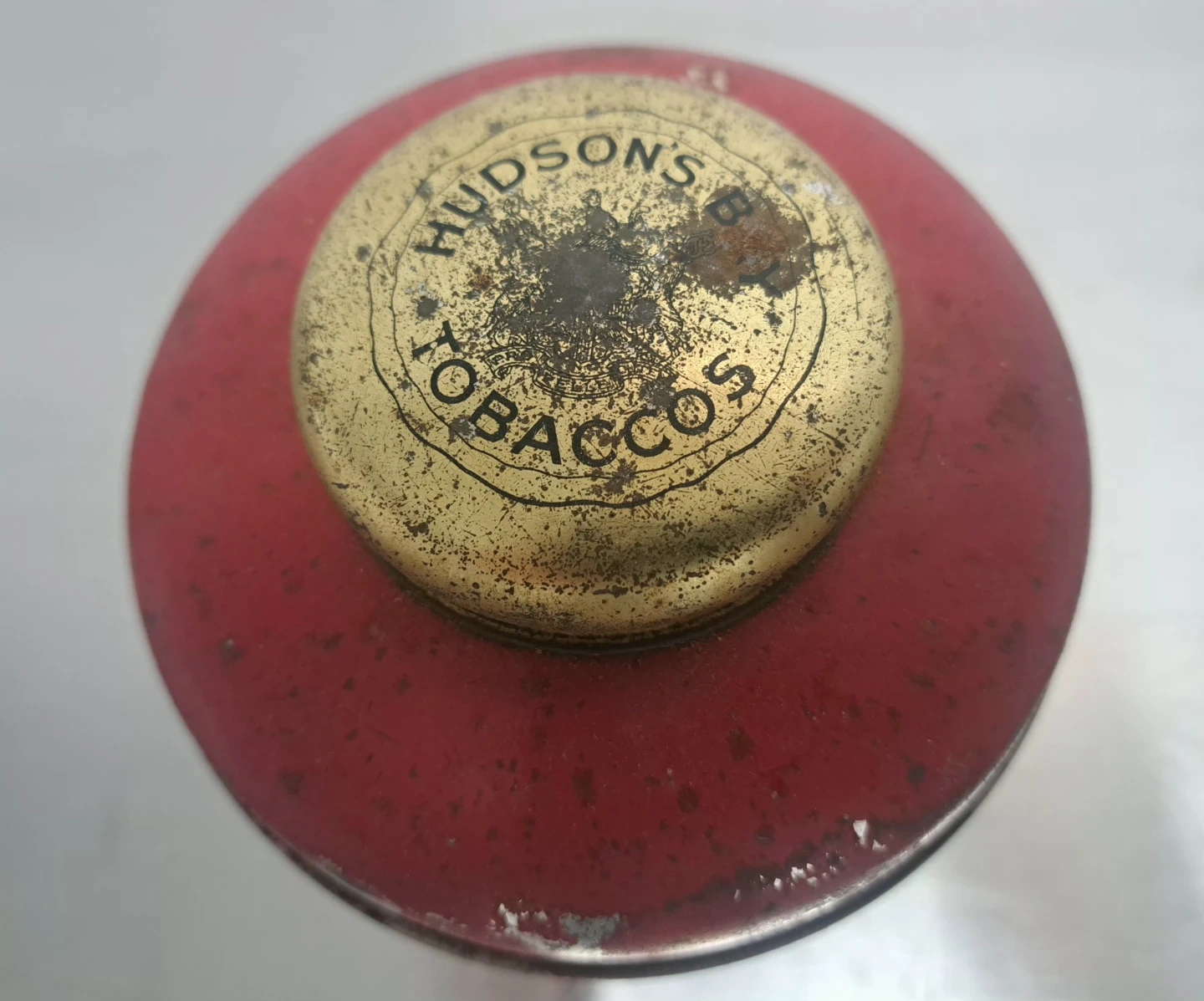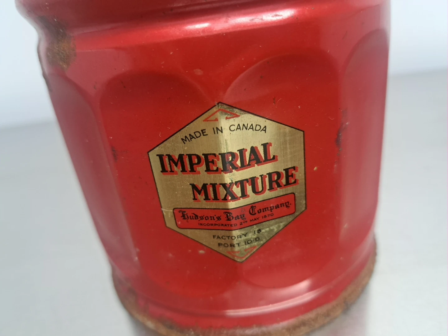 This is a vintage tin for Hudson's Bay Imperial Mixture. It and features a gold lid stamped with "Hudson's Bay Tobaccos". The tin is red with a label indicating "Imperial Mixture" and "Hudson's Bay Company".