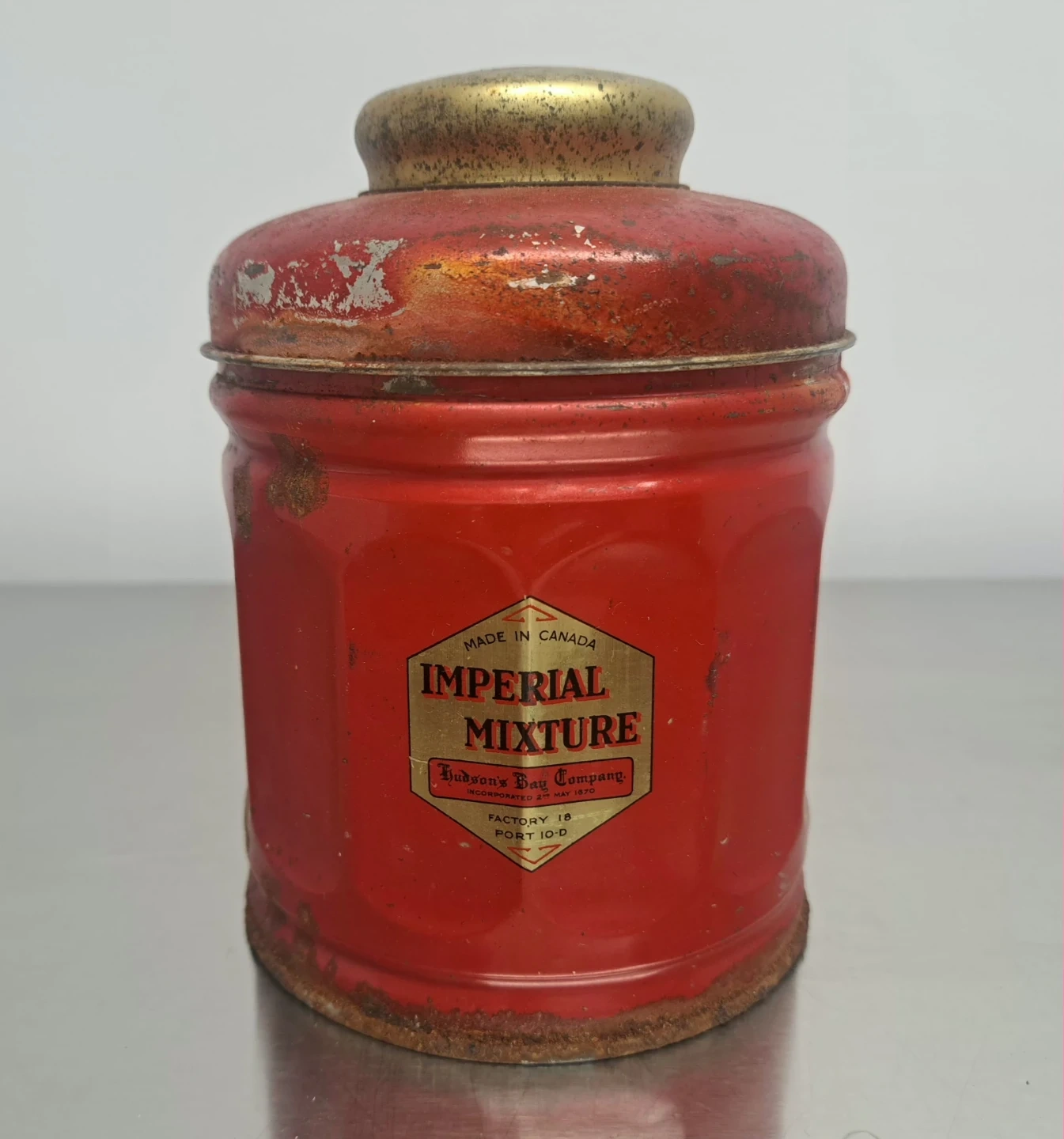 This is a vintage tin for Hudson's Bay Imperial Mixture. It and features a gold lid stamped with "Hudson's Bay Tobaccos". The tin is red with a label indicating "Imperial Mixture" and "Hudson's Bay Company".
