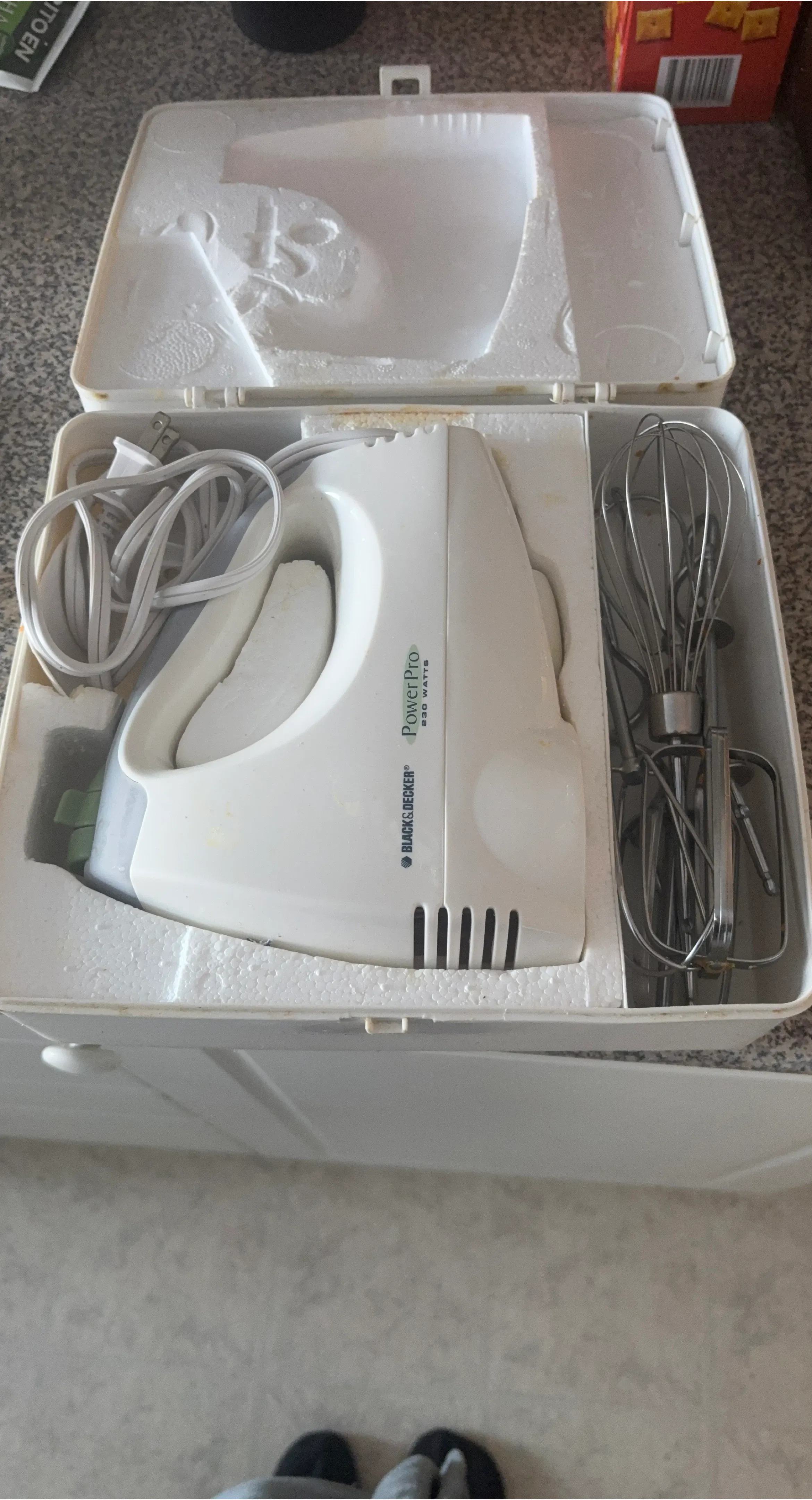 This is a BLACK+DECKER PowerPro hand mixer with beaters and a storage case. It has 230 watts of power. It's great for whipping cream or mixing batters.