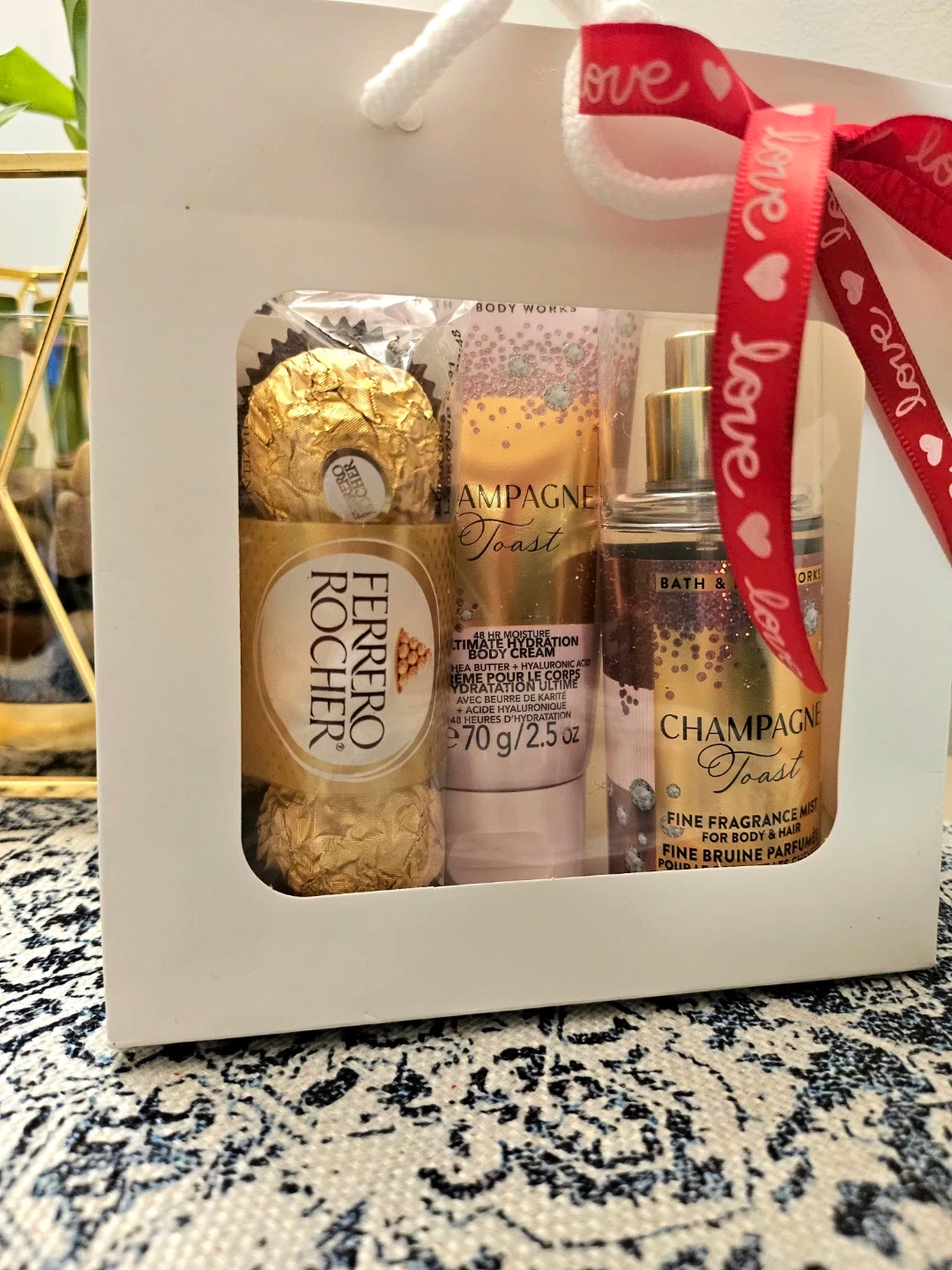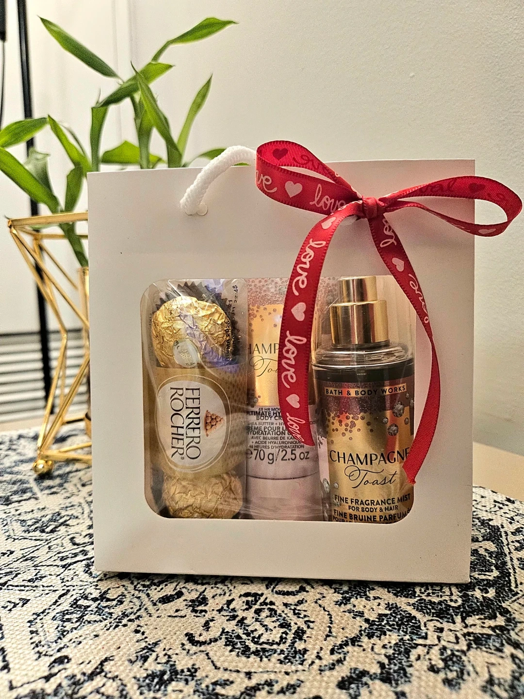 This cute gift set has Bath & Body Works Mini Champagne Toast body cream and fine fragrance mist. Also comes with a pack of Ferrero Rocher chocolates. All new, ready for a little treat or small gift.