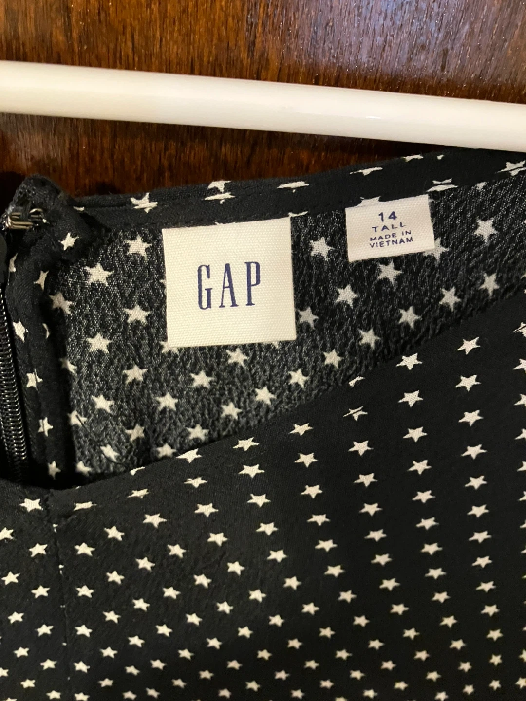 This GAP dress features a black background with a white star print. It's a size 14 Tall.. can also be worn like a tunic dress with leggings!