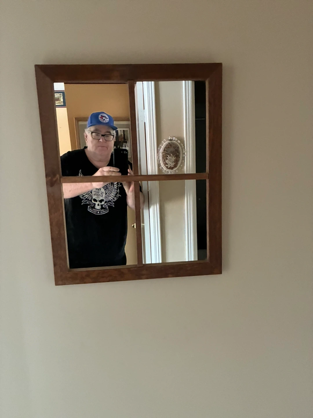 This is a wooden framed mirror with a divided pane design. It's perfect for hanging in an entryway or over a dresser. The wooden frame adds a rustic touch to any room.