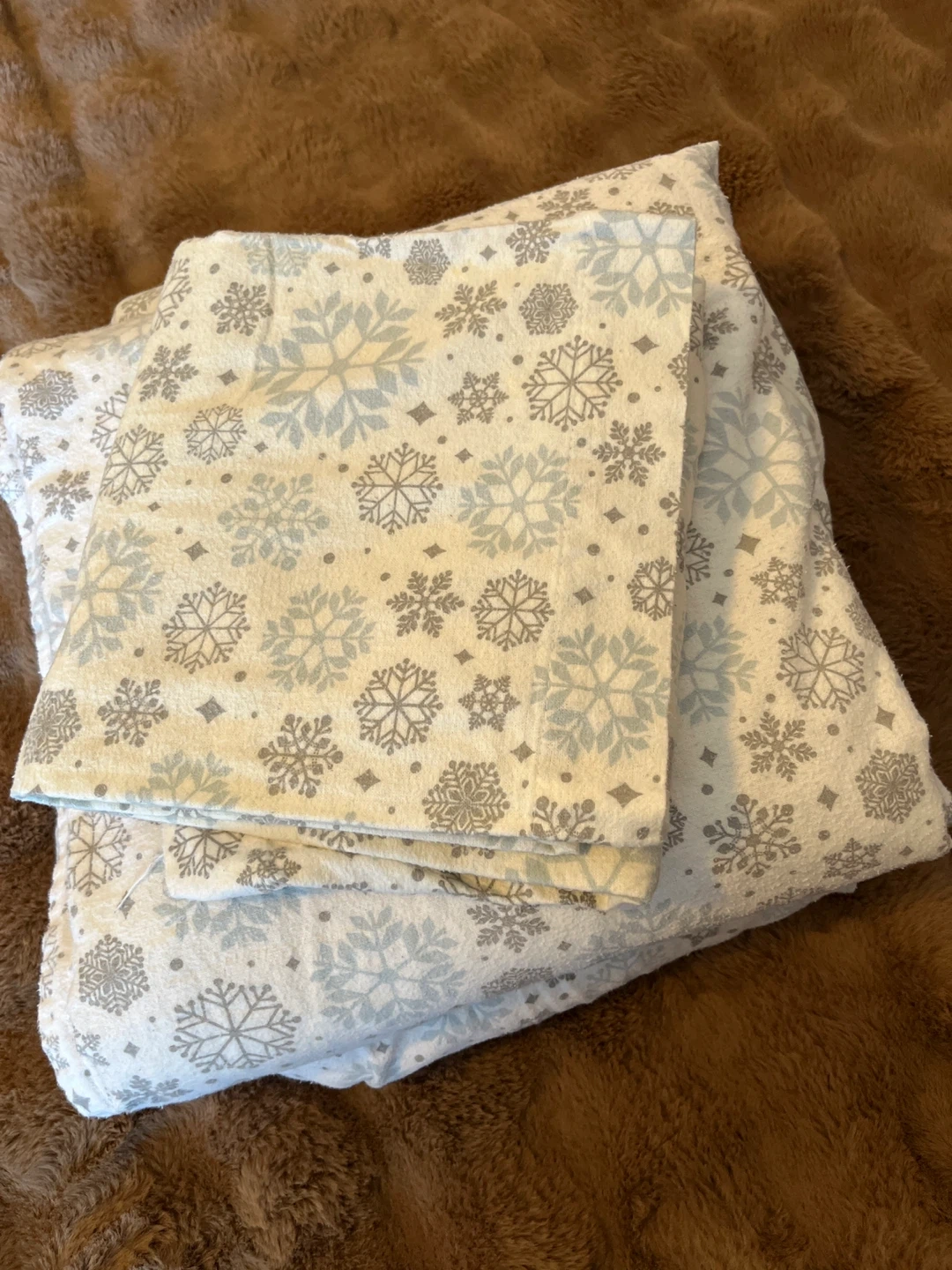 Cozy Queen flannel sheet set features a festive snowflake print. Perfect for keeping warm during the winter months! Also fall, winter cottage, camping ⛺️ ect. CASH only please.