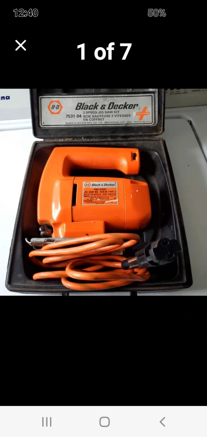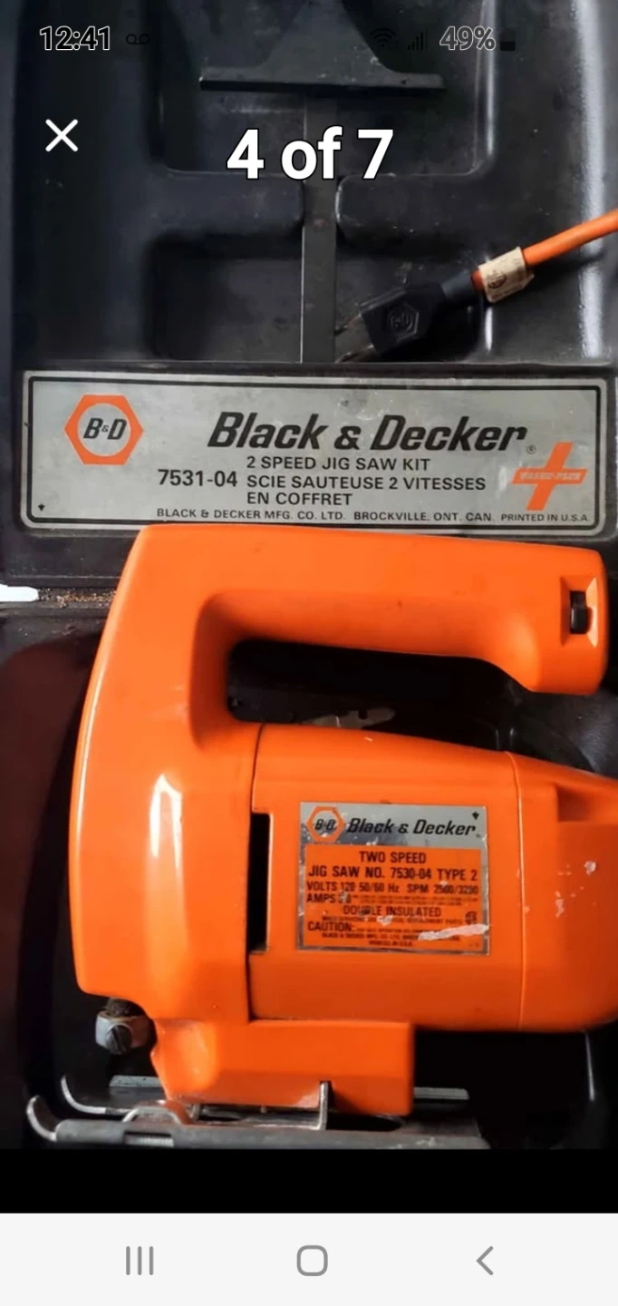 This is a vintage Black & Decker 2-speed jig saw kit. It's model number 7531-04. Comes in its original carrying case. Great shape, works perfectly.