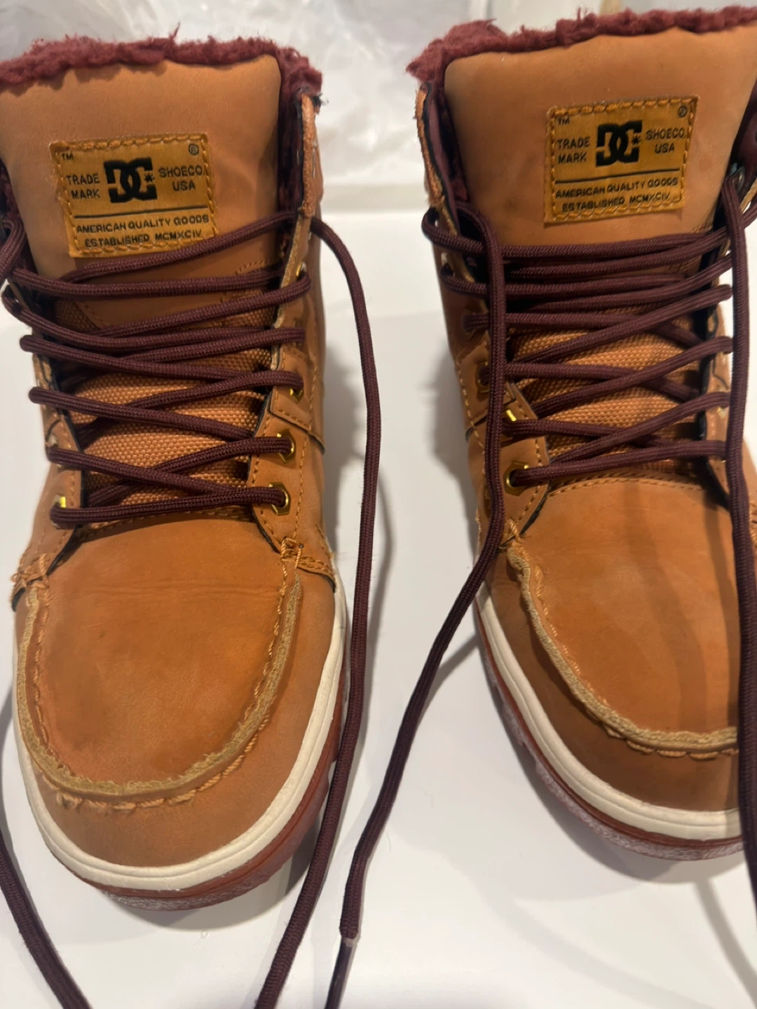 Brown DC Shoes winter boots with water-resistant features. They have a cozy, faux-fur lining for extra warmth. The durable rubber sole provides good traction.
