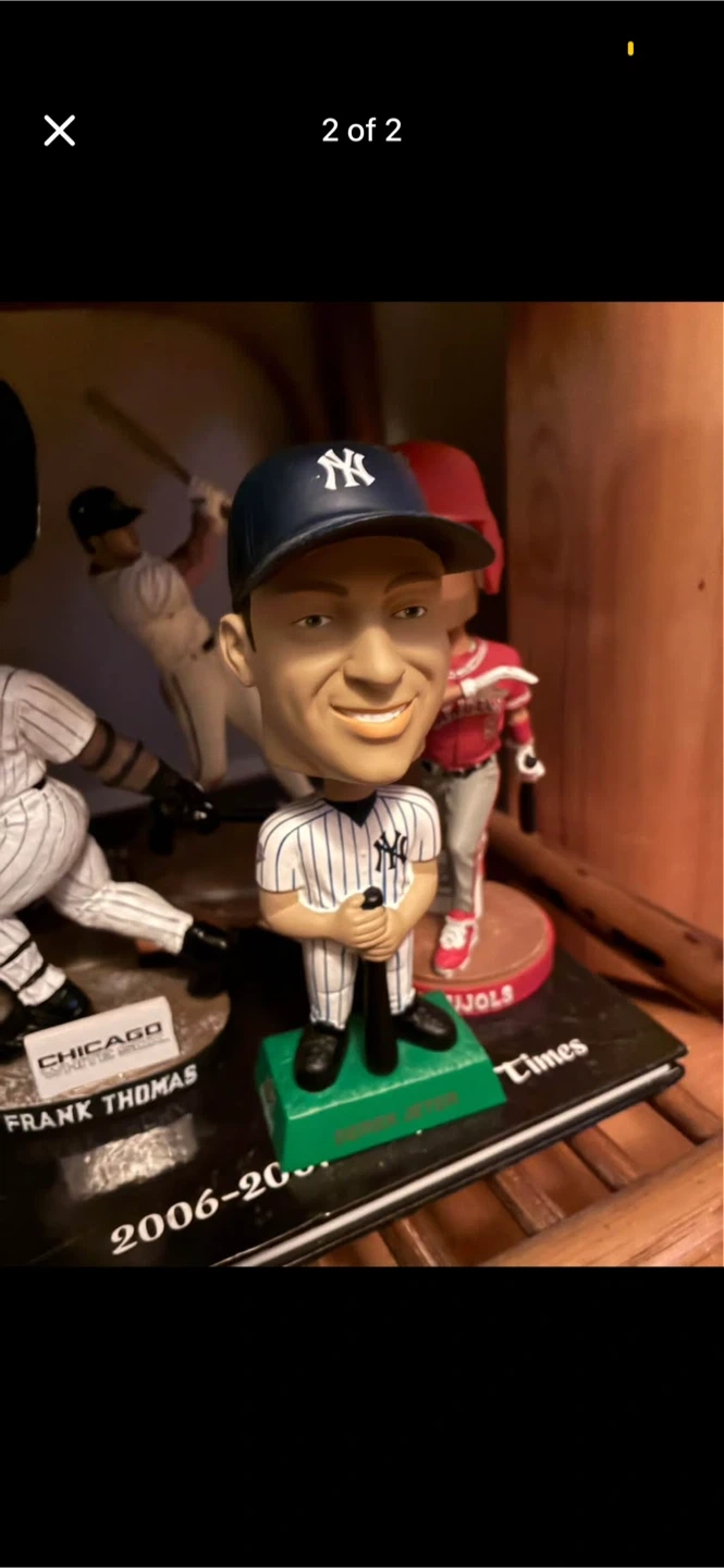 This Derek Jeter bobblehead features him in his New York Yankees uniform. It's mounted on a green base. This collectible is a great addition for any baseball fan!
