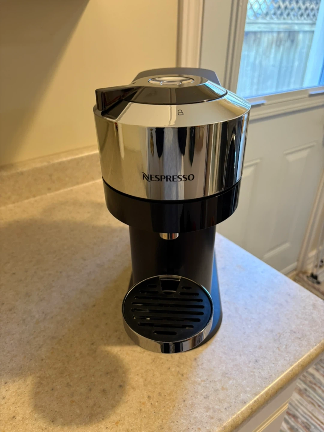 Nespresso Vertuo coffee machine, perfect for making your morning coffee. It has a sleek black and chrome design. It's easy to use and makes great tasting coffee. Like new!!!