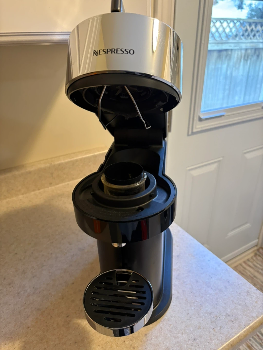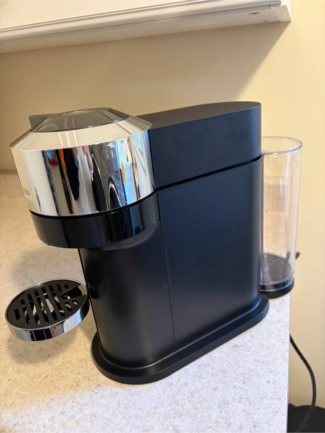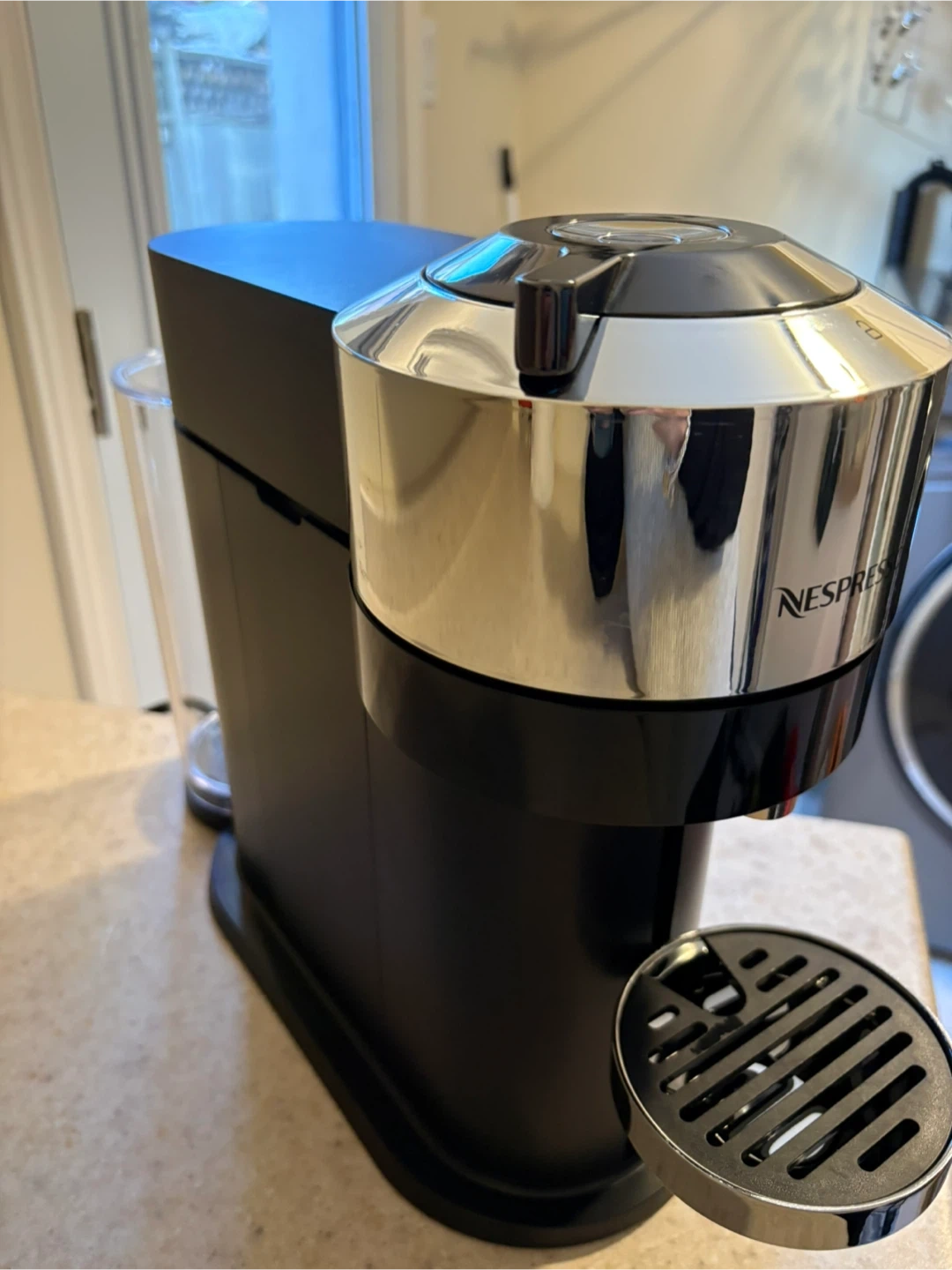 Nespresso Vertuo coffee machine, perfect for making your morning coffee. It has a sleek black and chrome design. It's easy to use and makes great tasting coffee. Like new!!!