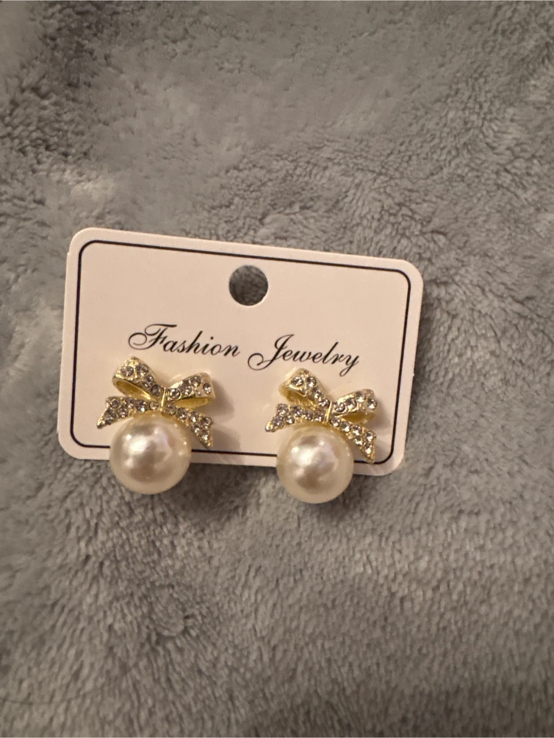 Sparkly bow earrings with a faux pearl drop. These earrings are for pierced ears. They add a touch of elegance to any outfit!