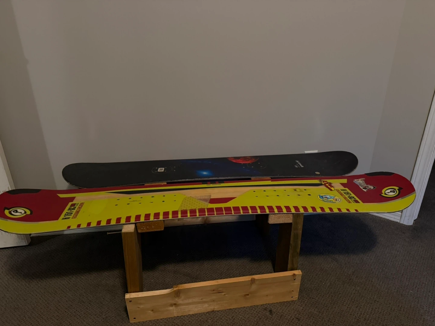 This is a Ride snowboard with a yellow and red design. It has 'Ride' clearly visible on the top. The snowboard is in good condition. It's ready for the slopes!