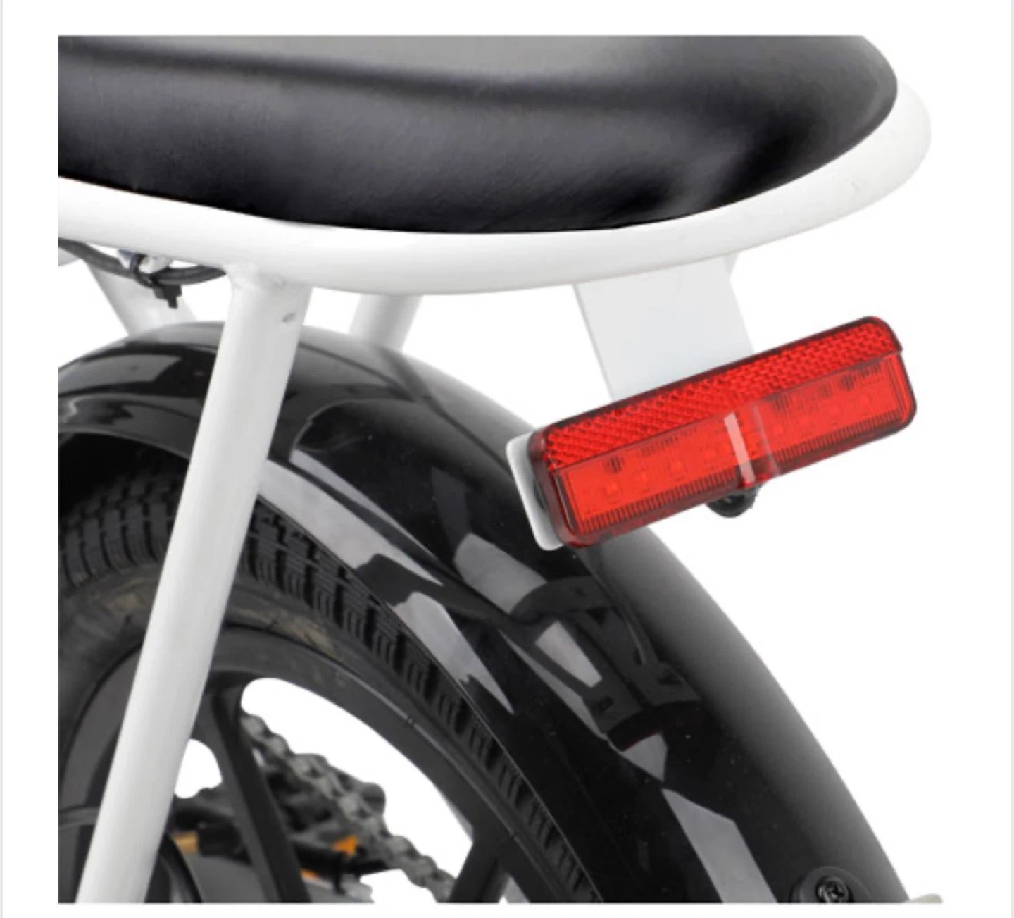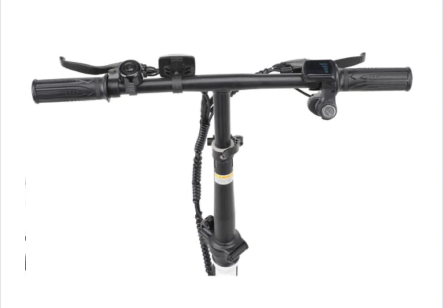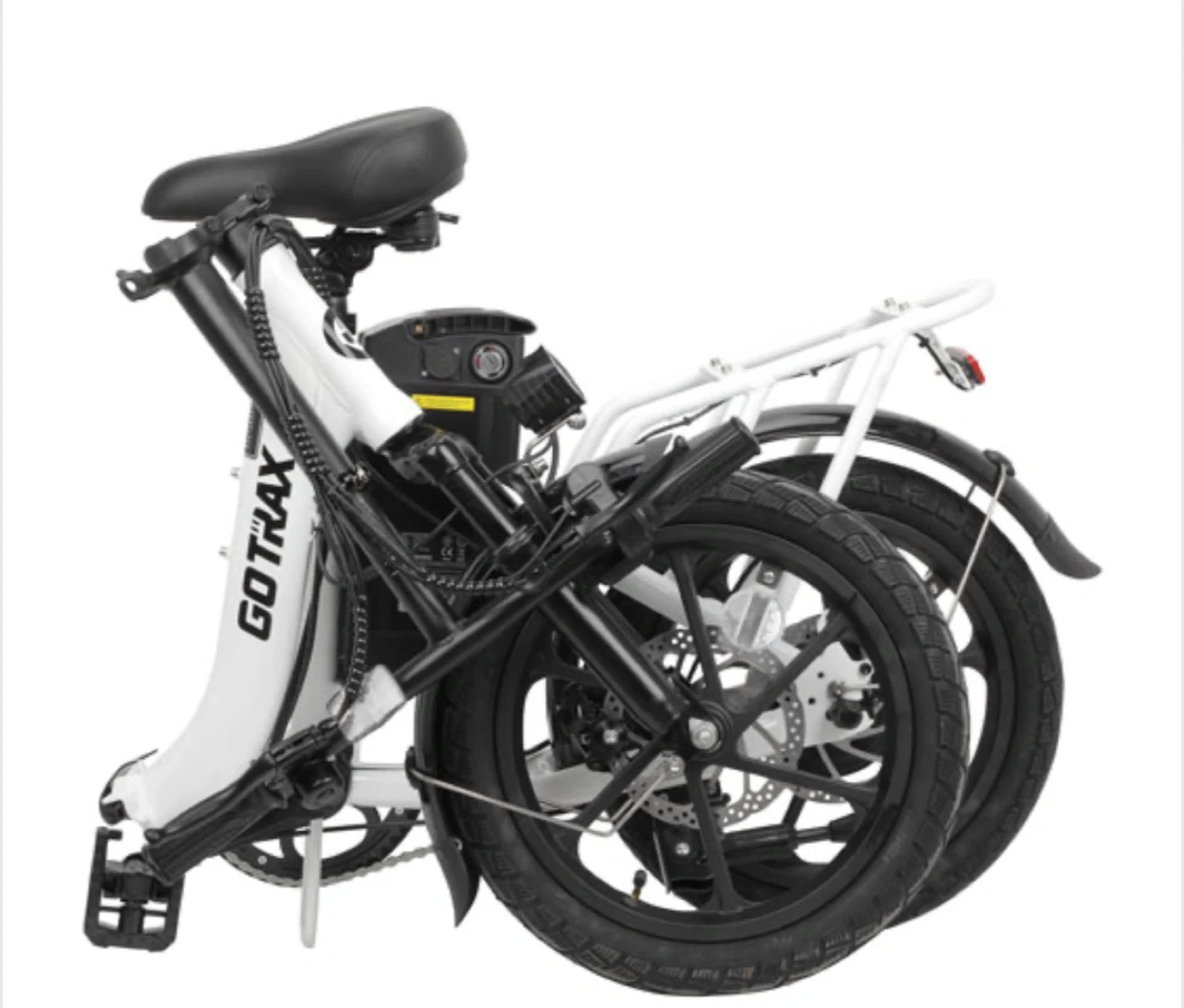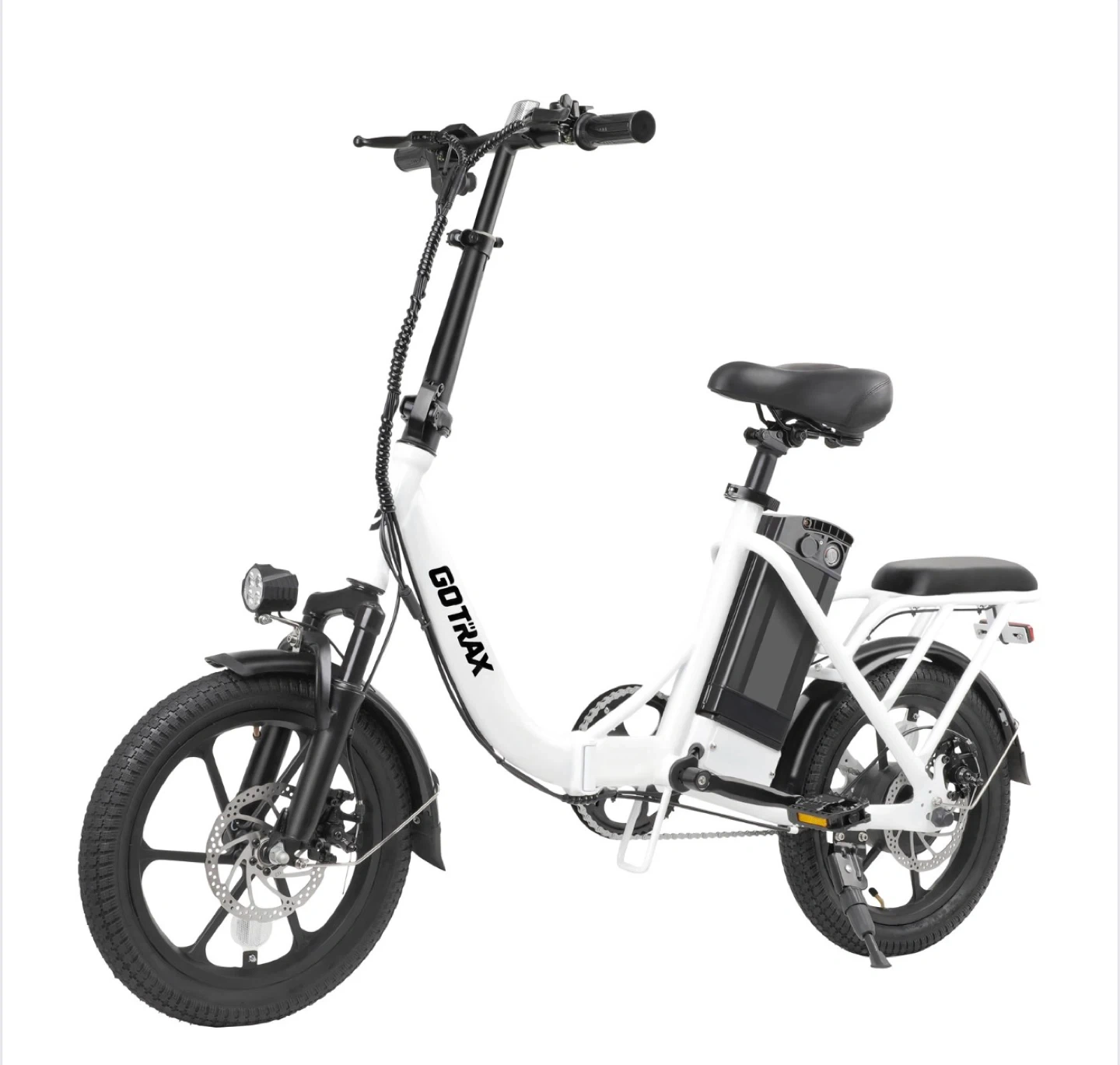 This is a GOTRAX folding electric bike in white. It's a compact e-bike designed for convenient commuting and portability. It features a built-in battery pack and a headlight for visibility. This bike folds for easy storage and transport.