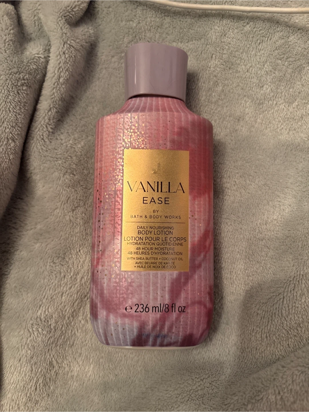 Bath & Body Works Vanilla Ease body lotion. Daily nourishing formula with 48-hour moisture. Made with shea butter and coconut oil. Volume is 236 ml or 8 fl oz.