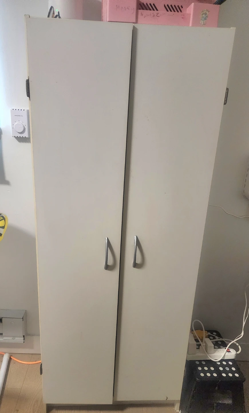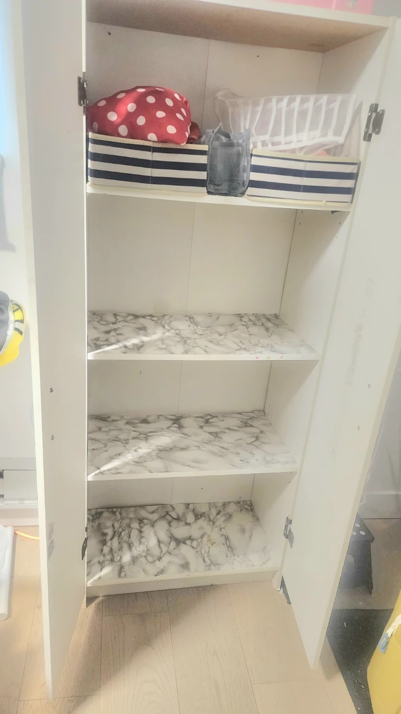 2 white two-door storage cabinet with 4 shelves each. The shelves are lined with a marble-patterned contact paper. It's a good size for a closet or small space storage. 2ft by 5ft