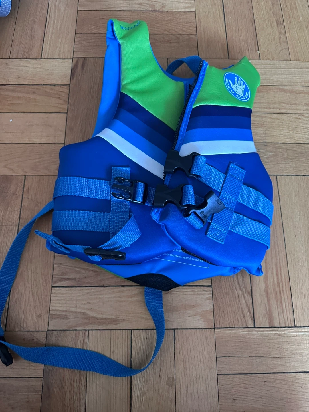 This blue and green Body Glove child life vest is designed for water safety. It features adjustable straps for a secure fit and a zippered front closure. Designed for children, it offers buoyancy for water activities.