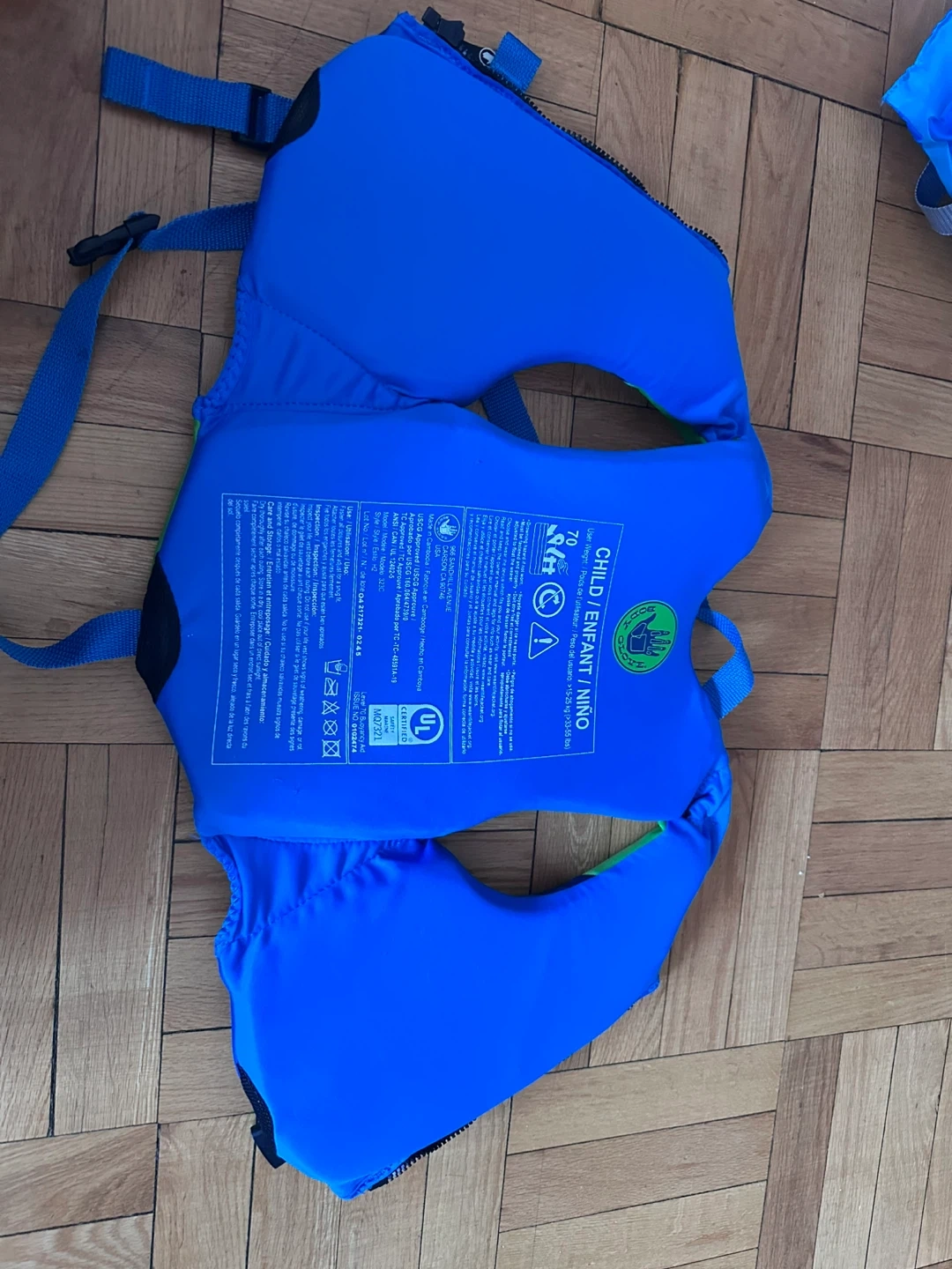 This blue and green Body Glove child life vest is designed for water safety. It features adjustable straps for a secure fit and a zippered front closure. Designed for children, it offers buoyancy for water activities.