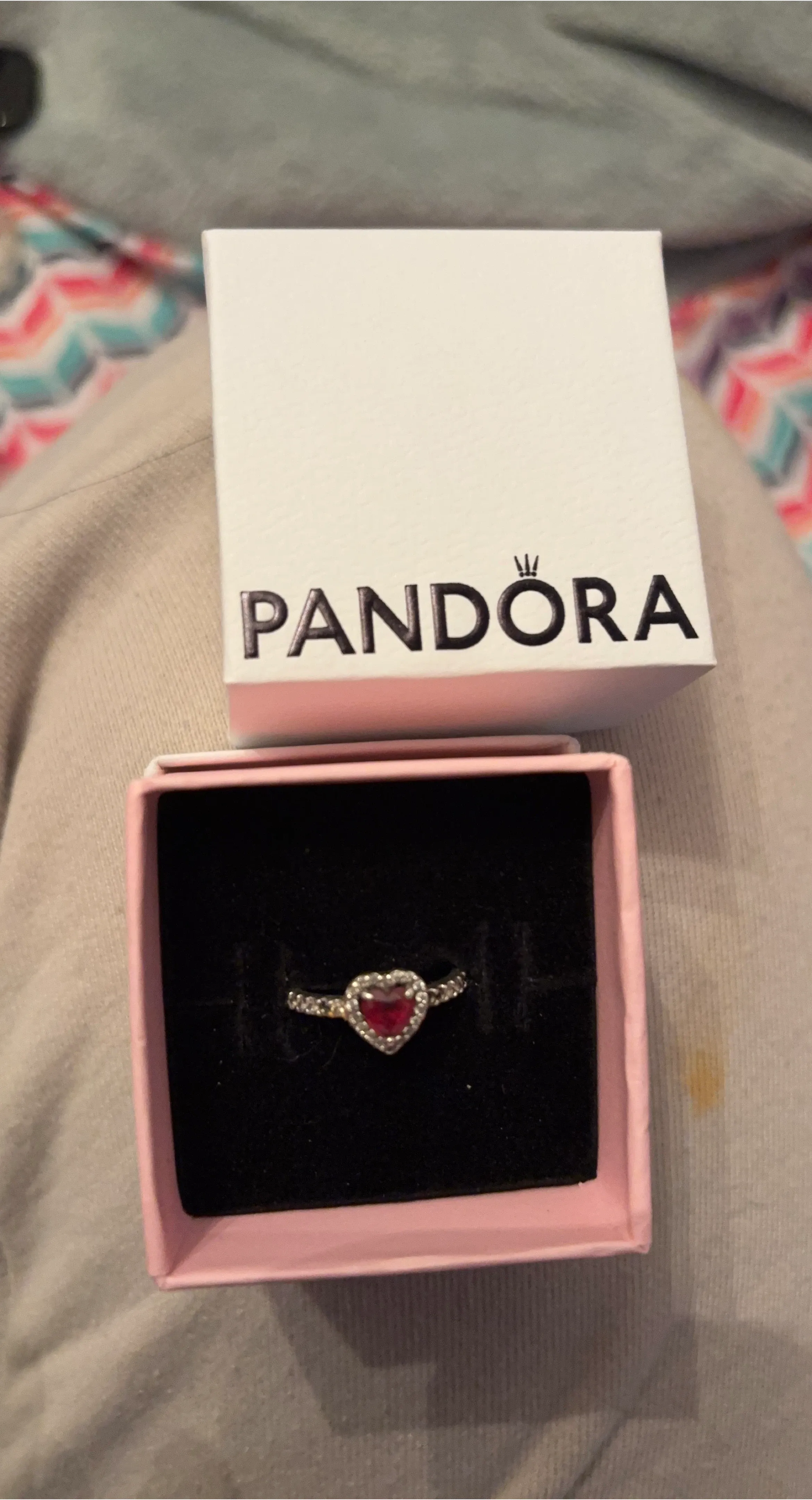 Pandora ring featuring a red heart-shaped stone surrounded by clear accent stones. It comes in its original Pandora box. Sterling silver band.
