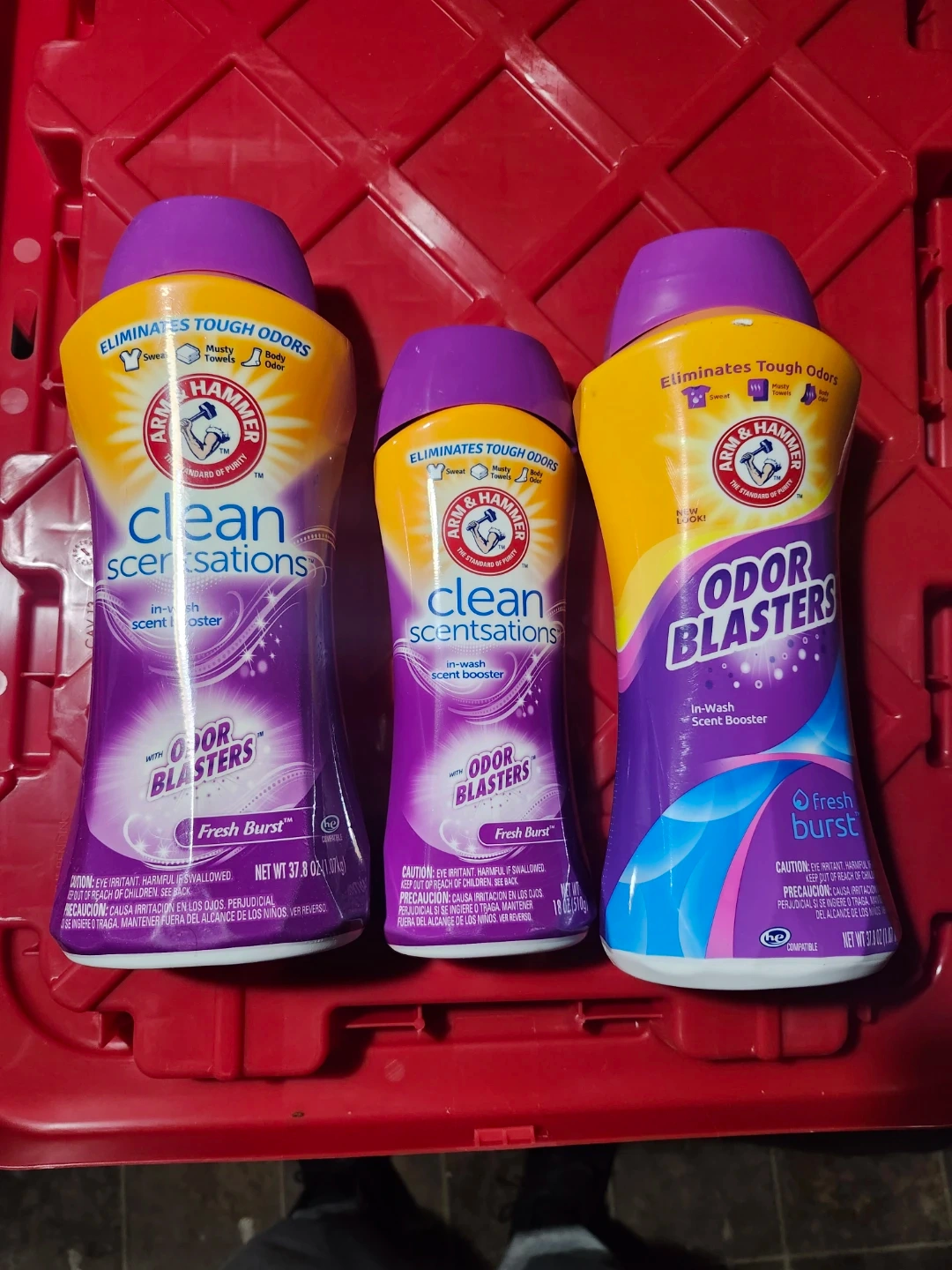 Arm & Hammer Clean Scentsations and Odor Blasters in-wash scent boosters. Eliminates tough odors from sweat, musty towels, and body odor. Fresh Burst scent. 3 containers, 37.8oz, 18oz and 37.8oz. All new and sealed.