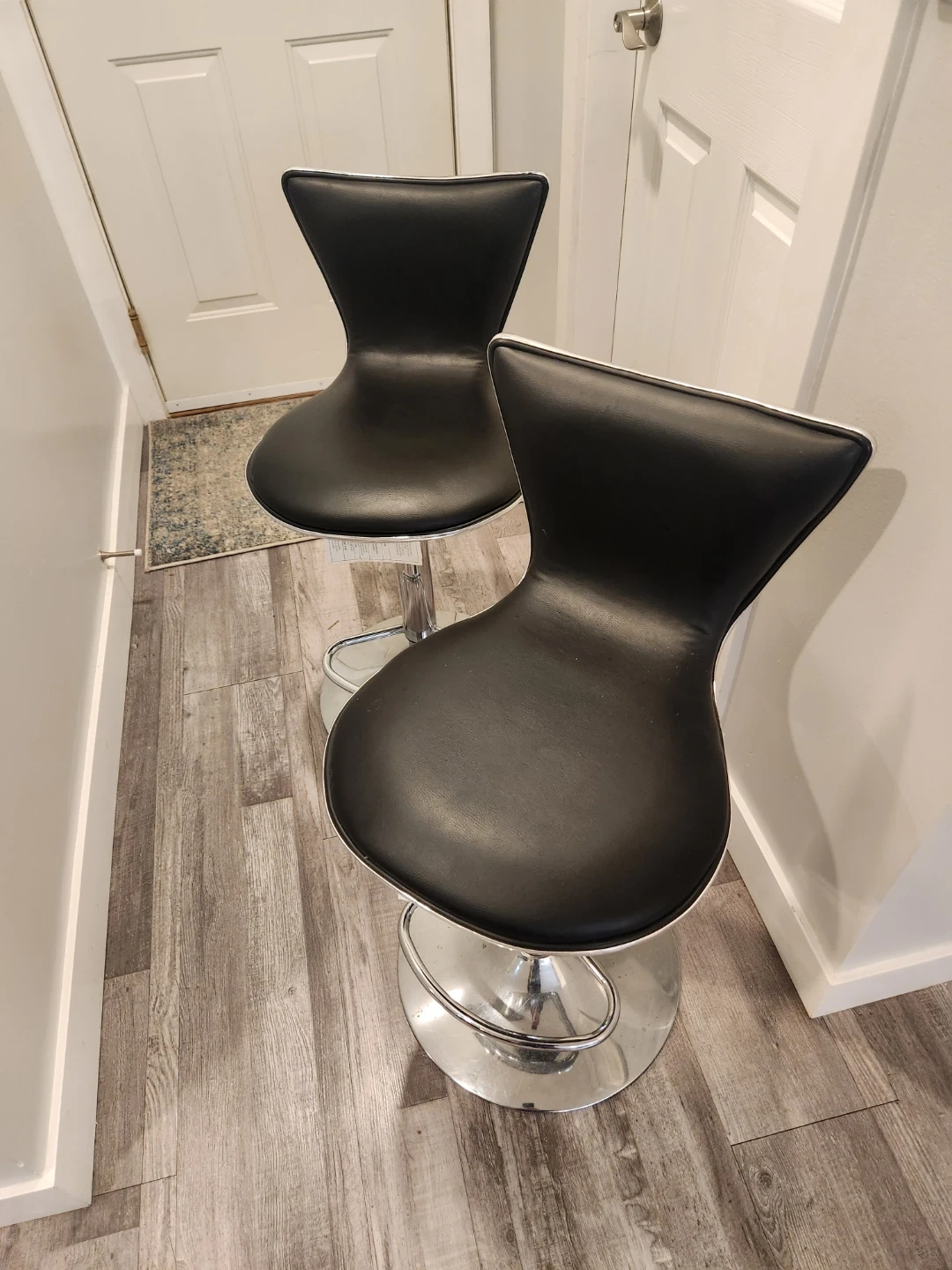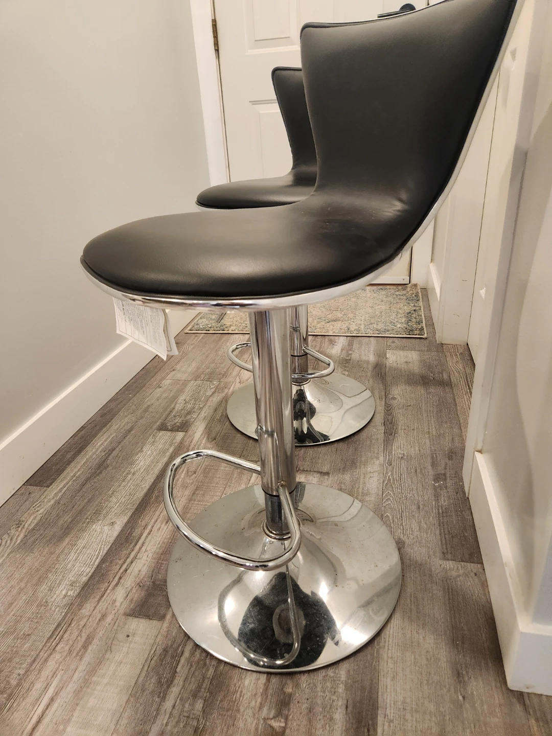 Selling a set of two black bar stools. They're adjustable in height with a chrome base. The seats are cushioned for comfort.