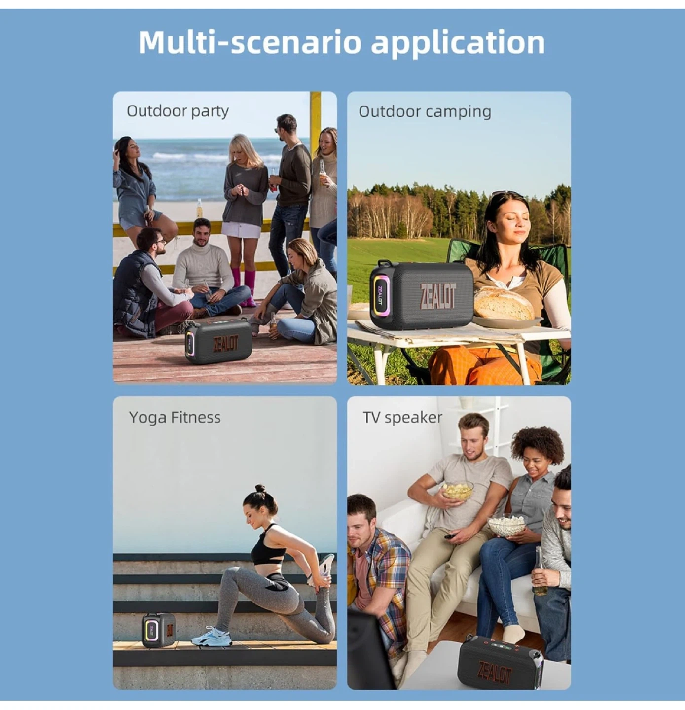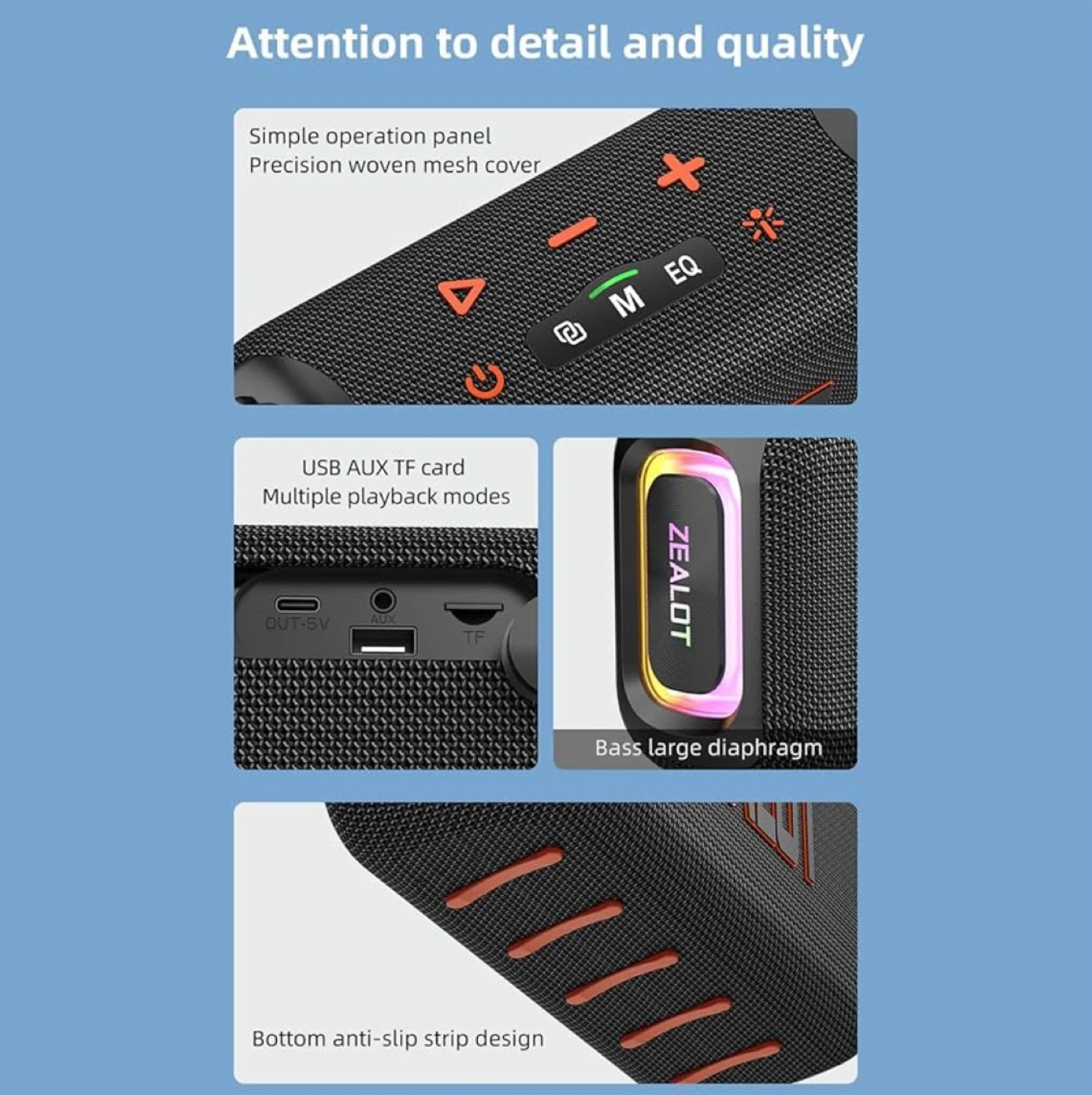 This ZEALOT portable wireless speaker features a 50W powerful subwoofer with a bass double diaphragm. It supports USB, AUX, and TF card playback modes. Includes a storage bag, charging cable, and AUX cable.