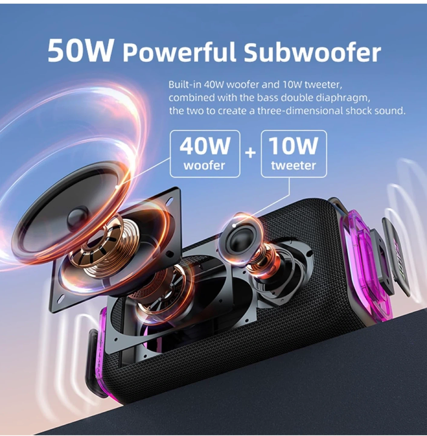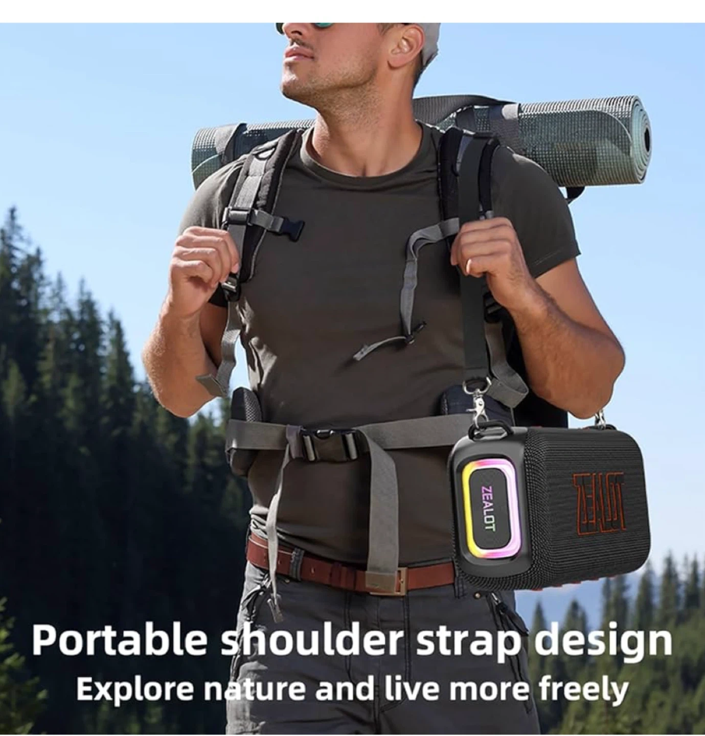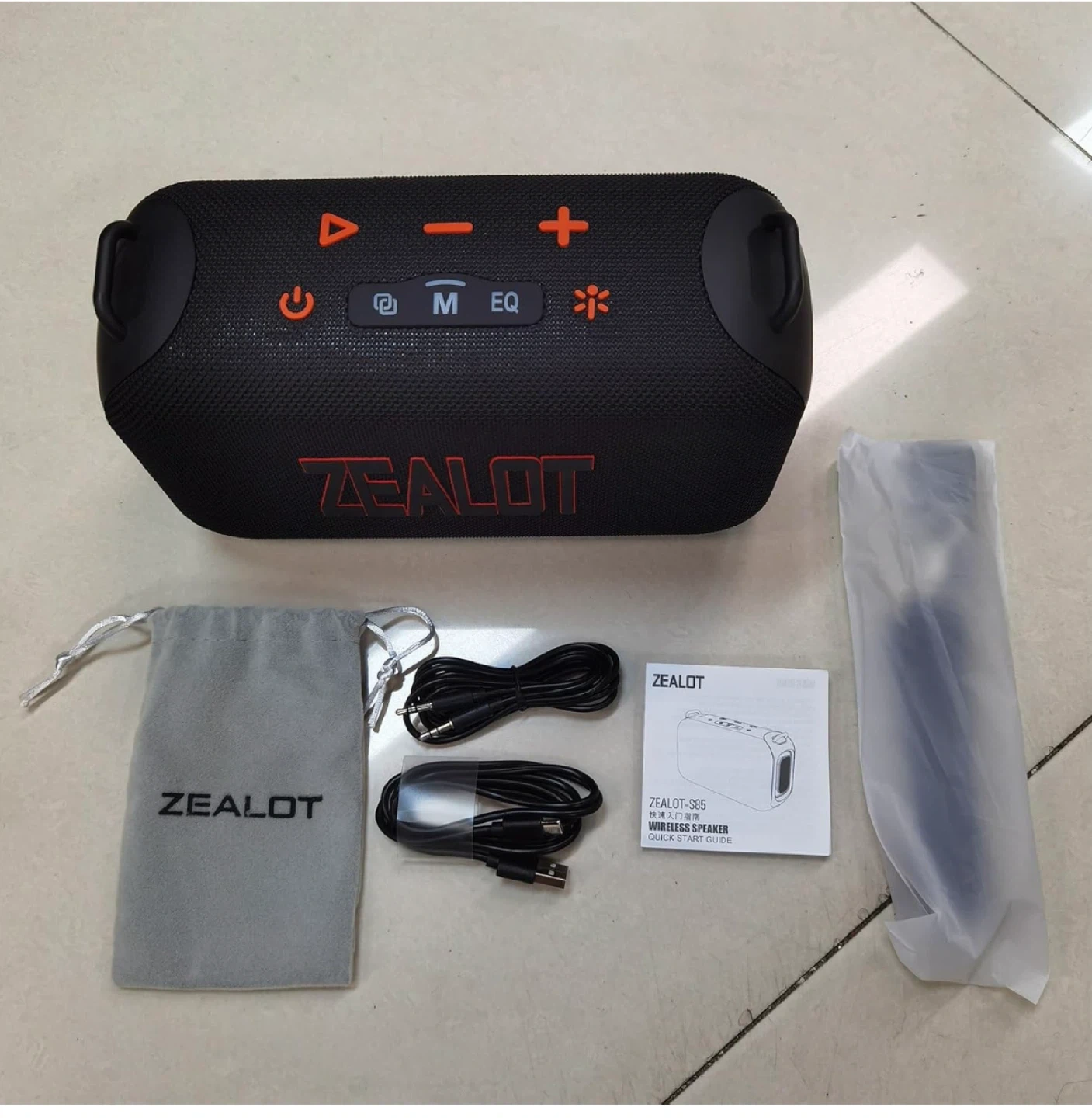 This ZEALOT portable wireless speaker features a 50W powerful subwoofer with a bass double diaphragm. It supports USB, AUX, and TF card playback modes. Includes a storage bag, charging cable, and AUX cable.