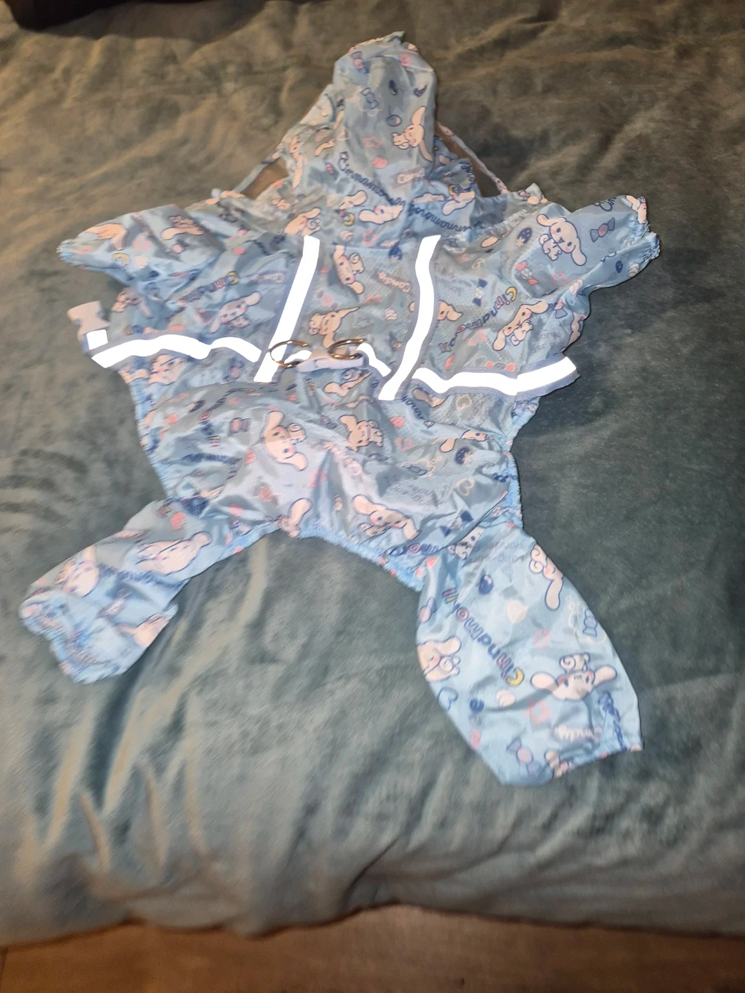 This is a light blue dog raincoat featuring the Cinnamoroll character. It has reflective stripes for visibility and an attached hood. Material appears to be waterproof fabric.