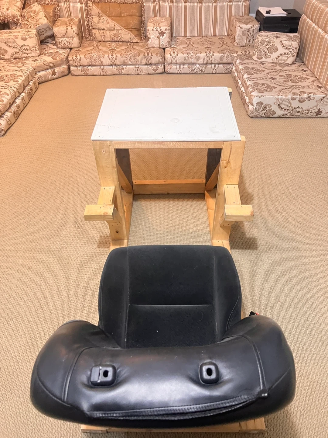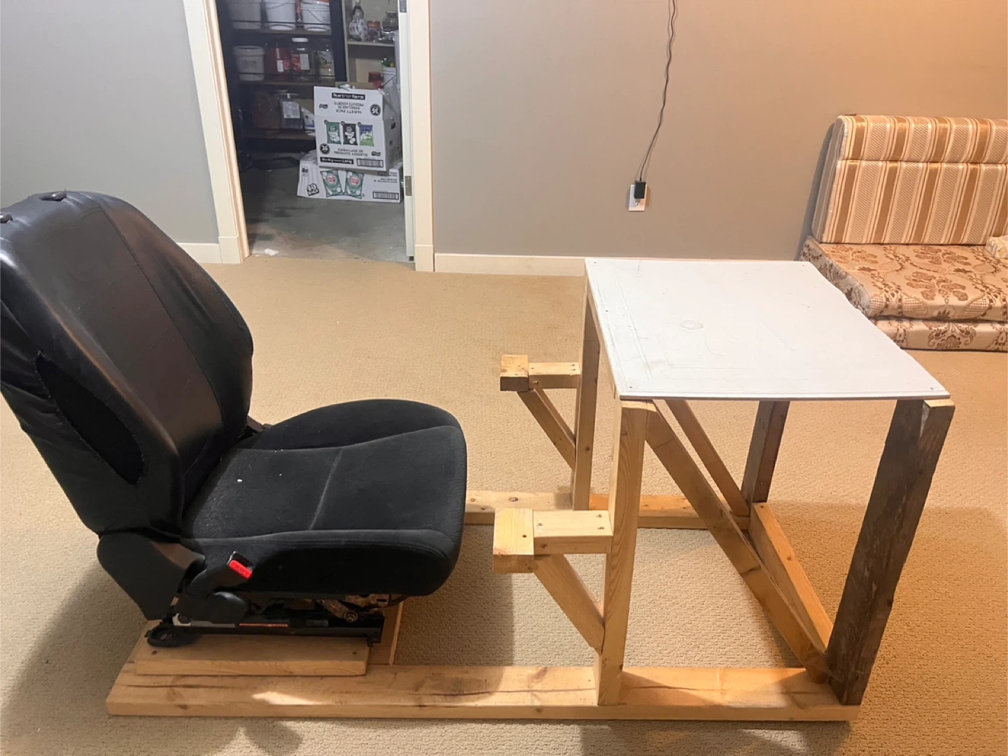 This is a custom-built racing simulator setup. It includes a car seat mounted on a wooden frame with an attached desk. Perfect for racing enthusiasts looking for a DIY setup at a affordable cost!