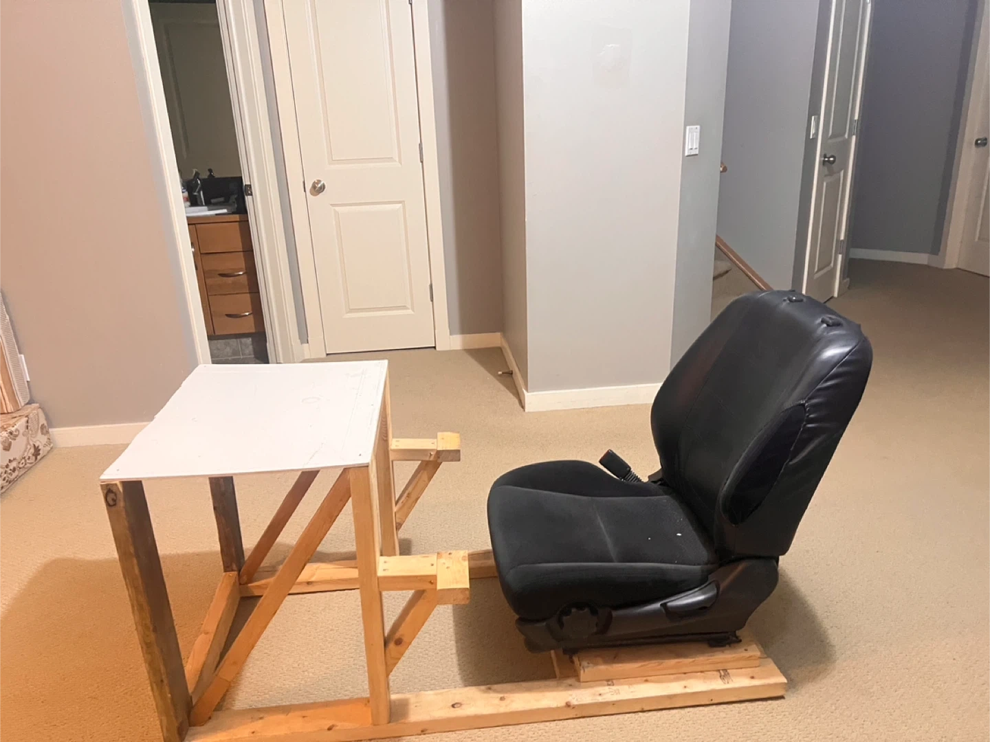 This is a custom-built racing simulator setup. It includes a car seat mounted on a wooden frame with an attached desk. Perfect for racing enthusiasts looking for a DIY setup at a affordable cost!