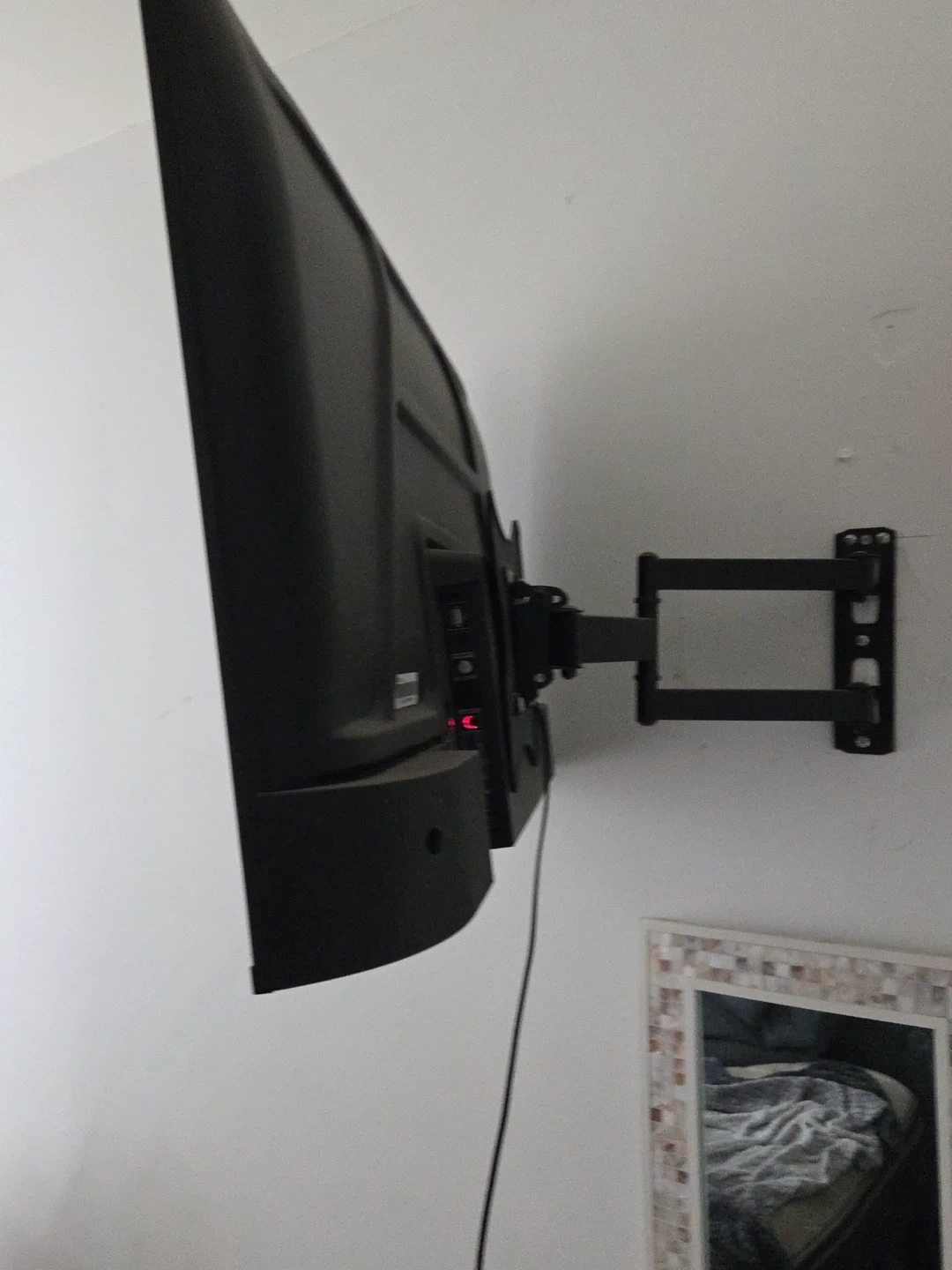 This is a TCL smart TV, comes with an adjustable wall mount and accessories in the box. It's a great addition to any room! Includes remote and power cable. 43”