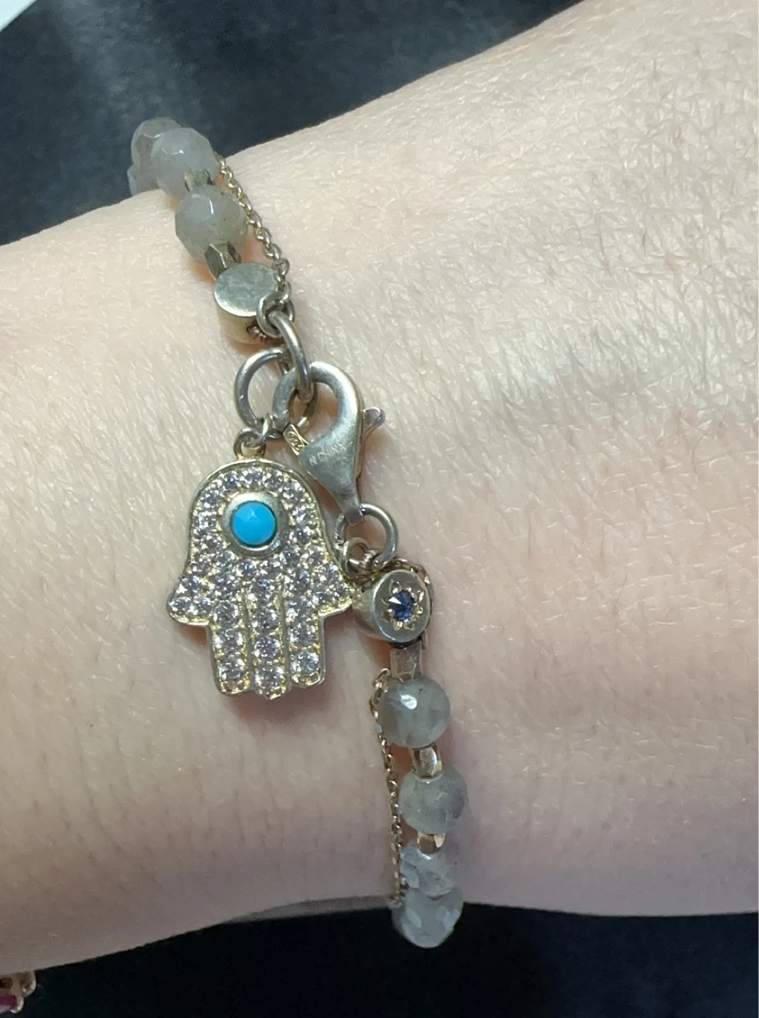 This is a lovely double-strand bracelet featuring greyish-blue faceted beads. It has a sterling silver chain and a sparkling Hamsa hand charm with a turquoise stone accent. The bracelet is finished with a lobster clasp. It's approximately 7.5 inches long.