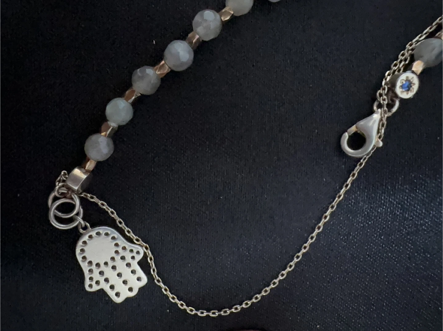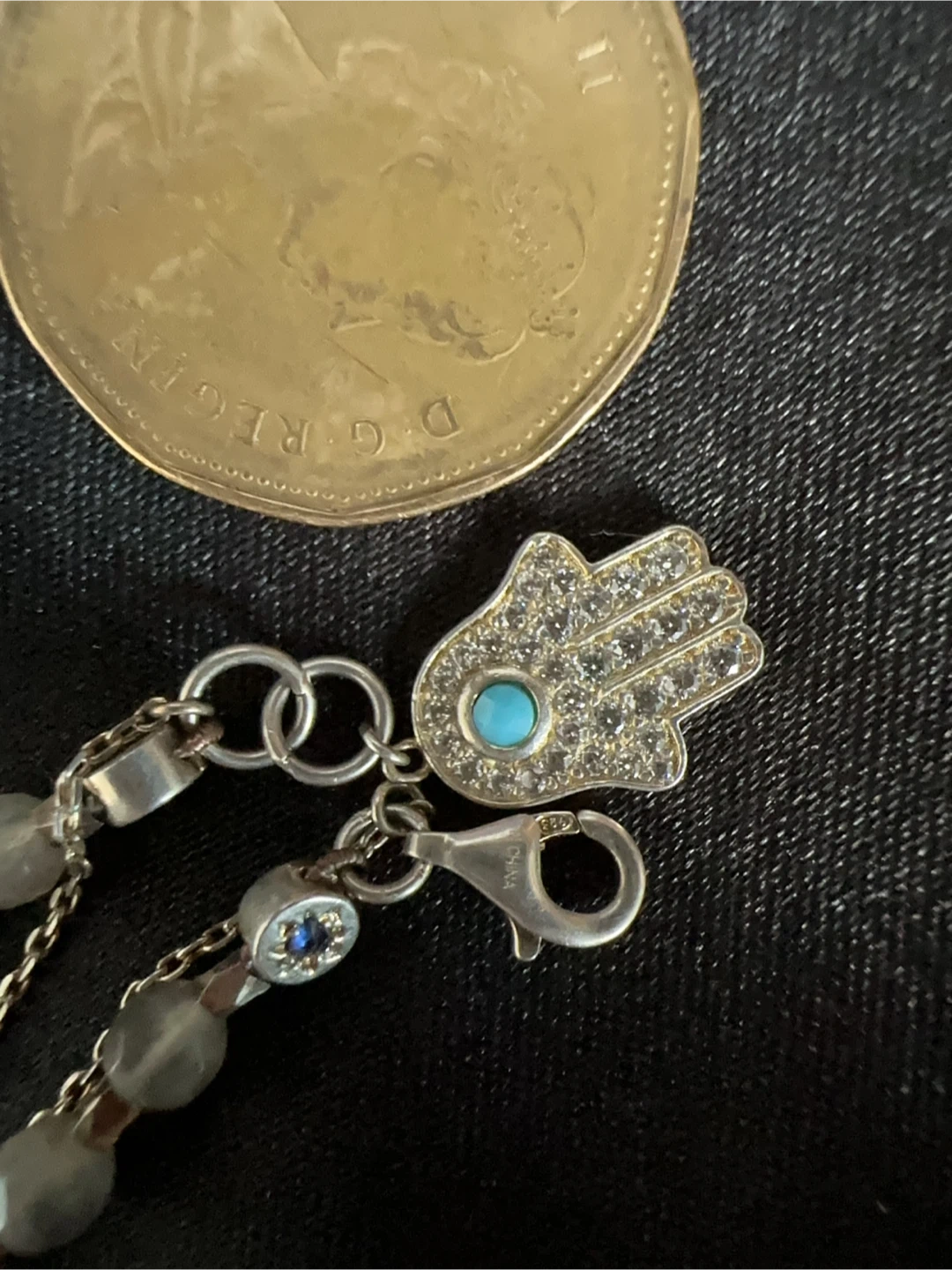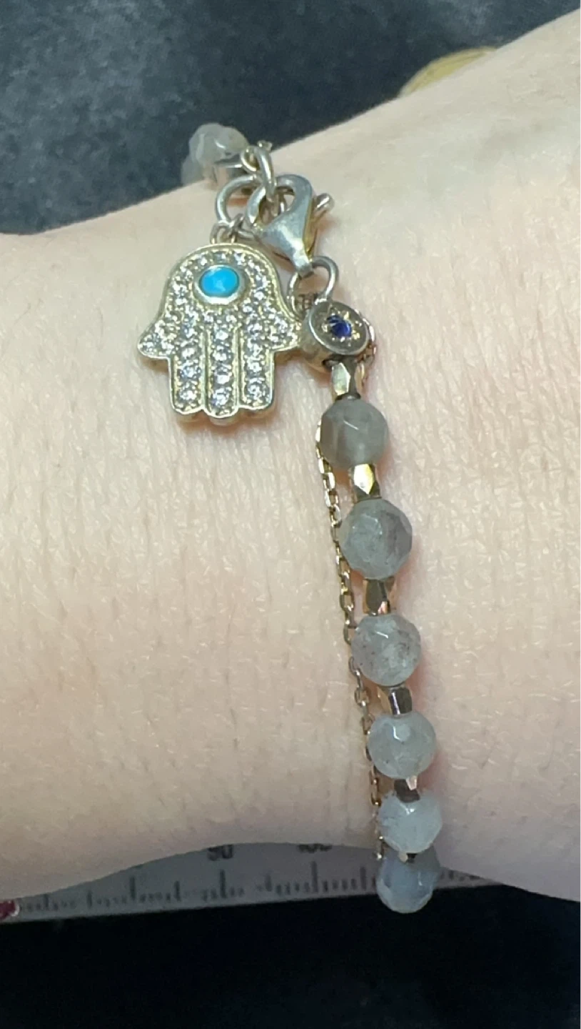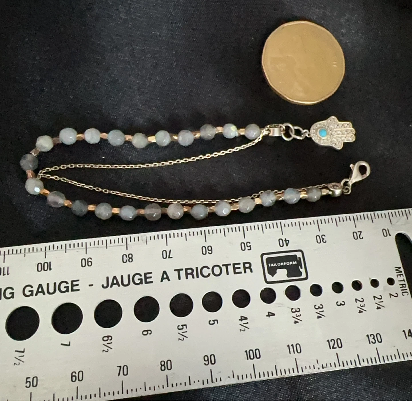This is a lovely double-strand bracelet featuring greyish-blue faceted beads. It has a sterling silver chain and a sparkling Hamsa hand charm with a turquoise stone accent. The bracelet is finished with a lobster clasp. It's approximately 7.5 inches long.